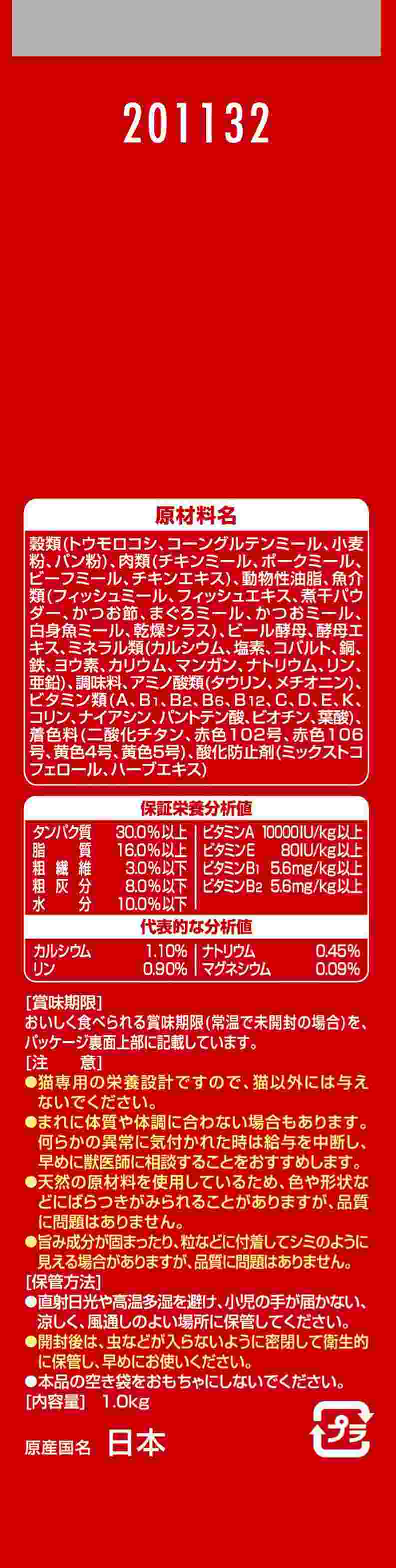 原材料穀類(トウモロコシ、コーングルテンミール、小麦粉、パン粉)、肉類(チキンミール、ポークミール、ビーフミール、チキンエキス)、動物性油脂、魚介類(フィッシュミール、フィッシュエキス、煮干パウダー、かつお節、まぐろミール、かつおミール、白身魚ミール、乾燥シラス)、ビール酵母、酵母エキス、ミネラル類(カルシウム、塩素、コバルト、銅、鉄、ヨウ素、カリウム、マンガン、リン、亜鉛)、アミノ酸類(タウリン、メチオニン)、ビタミン類(A、B1、B2、B6、B12、C、D、E、K、コリン、ナイアシン、パントテン酸、ビオチン、葉酸)、着色料(二酸化チタン、赤色102号、赤色106号、黄色4号、黄色5号)、調味料、酸化防止剤(ミックストコフェロール、ハーブエキス)