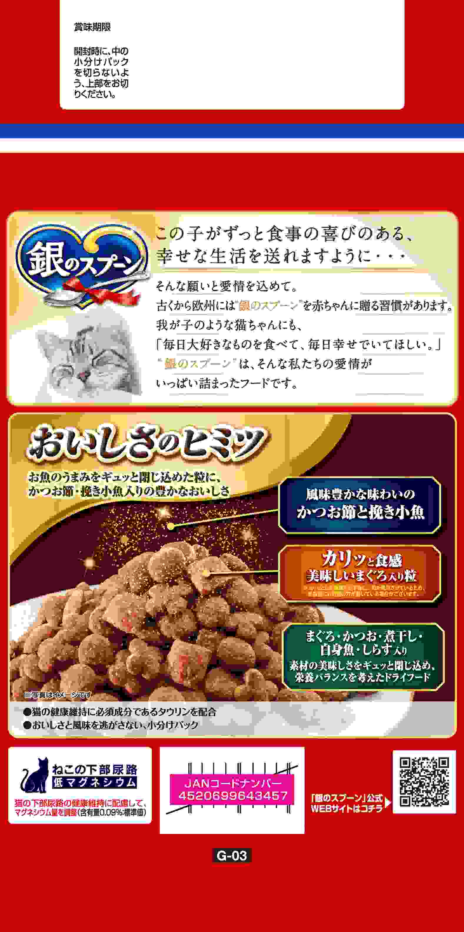 ・お魚のうまみたっぷりの贅沢うまみ仕立て・カリッと食感のおいしいまぐろ入り粒入り・毎日の食事に必要な栄養バランスを実現した全成長段階用総合栄養食・ねこの下部尿路の健康維持に配慮して、マグネシウム量を調整(含有量0.09%:標準値)
