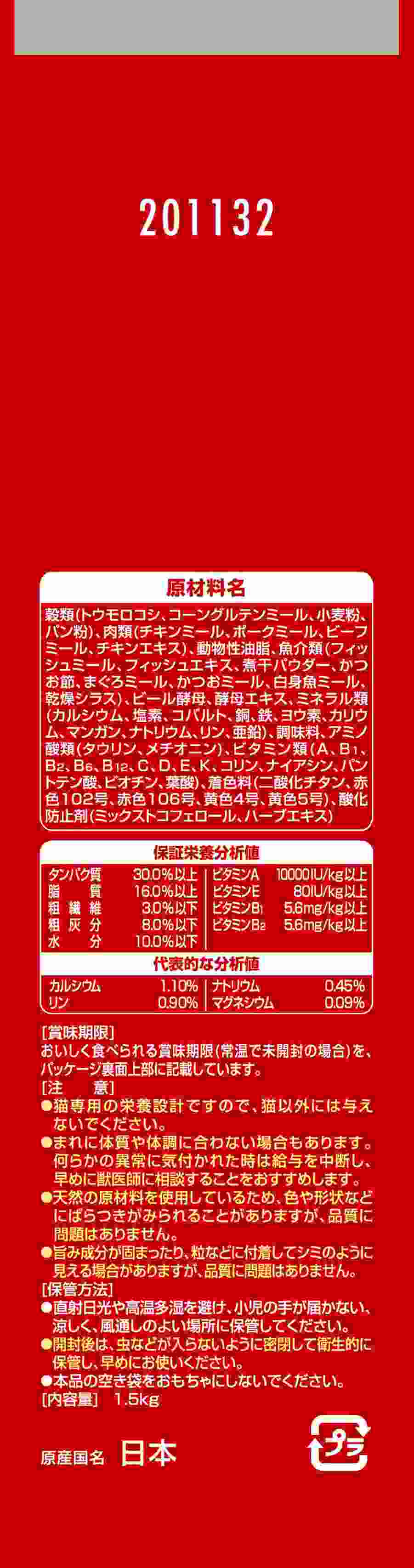 原材料穀類(トウモロコシ、コーングルテンミール、小麦粉、パン粉)、肉類(チキンミール、ポークミール、ビーフミール、チキンエキス)、動物性油脂、魚介類(フィッシュミール、フィッシュエキス、煮干パウダー、かつお節、まぐろミール、かつおミール、白身魚ミール、乾燥シラス)、ビール酵母、酵母エキス、ミネラル類(カルシウム、塩素、コバルト、銅、鉄、ヨウ素、カリウム、マンガン、リン、亜鉛)、アミノ酸類(タウリン、メチオニン)、ビタミン類(A、B1、B2、B6、B12、C、D、E、K、コリン、ナイアシン、パントテン酸、ビオチン、葉酸)、着色料(二酸化チタン、赤色102号、赤色106号、黄色4号、黄色5号)、調味料、酸化防止剤(ミックストコフェロール、ハーブエキス)