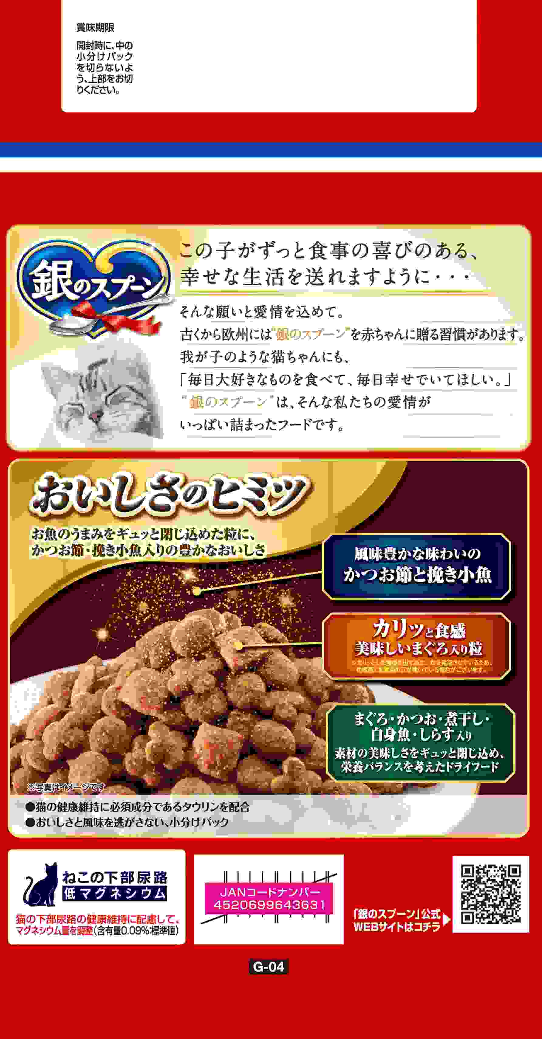 ・お魚のうまみたっぷりの贅沢うまみ仕立て・カリッと食感のおいしいまぐろ入り粒入り・毎日の食事に必要な栄養バランスを実現した全成長段階用総合栄養食・ねこの下部尿路の健康維持に配慮して、マグネシウム量を調整(含有量0.09%:標準値)