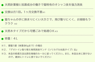 ◆天然針葉樹と抗菌成分の働きで猫特有のオシッコ臭を強力消臭◆交換は月1回。1ヶ月交換不要 ※愛猫1頭(体重8Kgまで)の場合◆猫ちゃんの手に挟まりにくい大きさで、飛び散りにくく、お掃除もラクラク ※デオトイレ取り替え専用消臭サンド(シリカゲル丸粒タイプ)比◆木タイプなので、可燃ゴミとして処理できます ※処理方法は居住地域のルールに従ってください