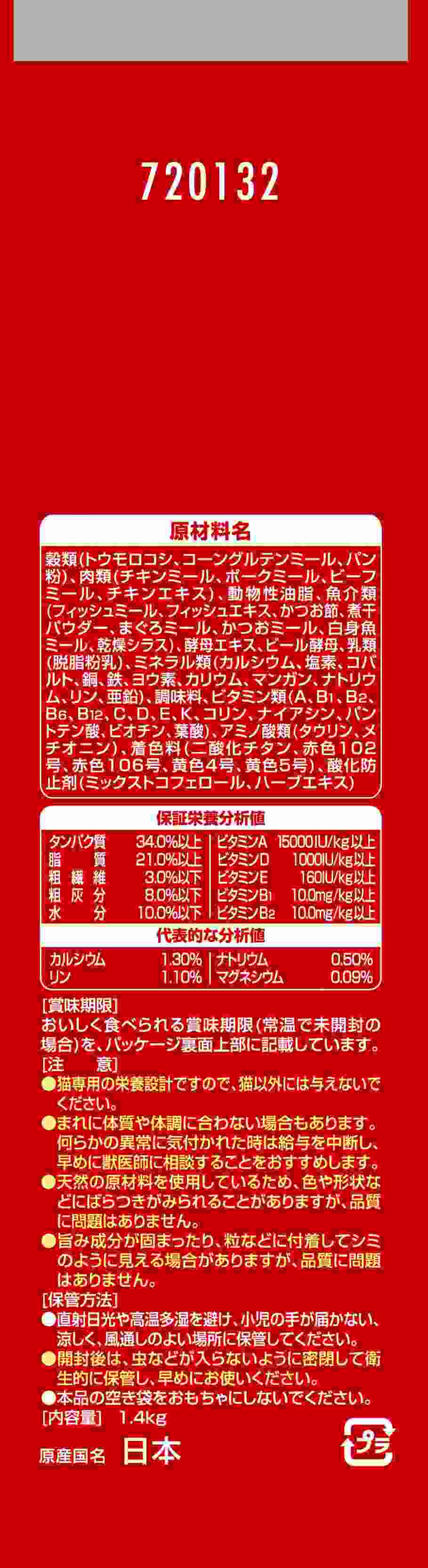 原材料穀類(トウモロコシ、コーングルテンミール、パン粉)、肉類(チキンミール、ポークミール、ビーフミール、チキンエキス)、動物性油脂、魚介類(フィッシュミール、フィッシュエキス、かつお節、煮干パウダー、まぐろミール、かつおミール、白身魚ミール、乾燥シラス)、酵母エキス、ビール酵母、卵類(卵パウダー)、乳類(脱脂粉乳)、ミネラル類(カルシウム、塩素、コバルト、銅、鉄、ヨウ素、カリウム、マンガン、リン、亜鉛)、ビタミン類(A、B1、B2、B6、B12、C、D、E、K、コリン、ナイアシン、パントテン酸、ビオチン、葉酸)、アミノ酸類(タウリン、メチオニン)、着色料(二酸化チタン、赤色102号、赤色106号、黄色4号、黄色5号)、酸化防止剤(ミックストコフェロール、ハーブエキス)