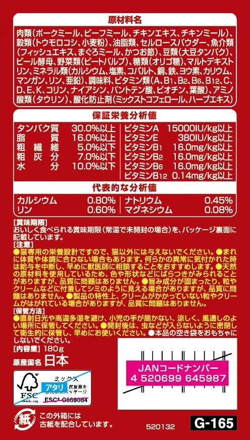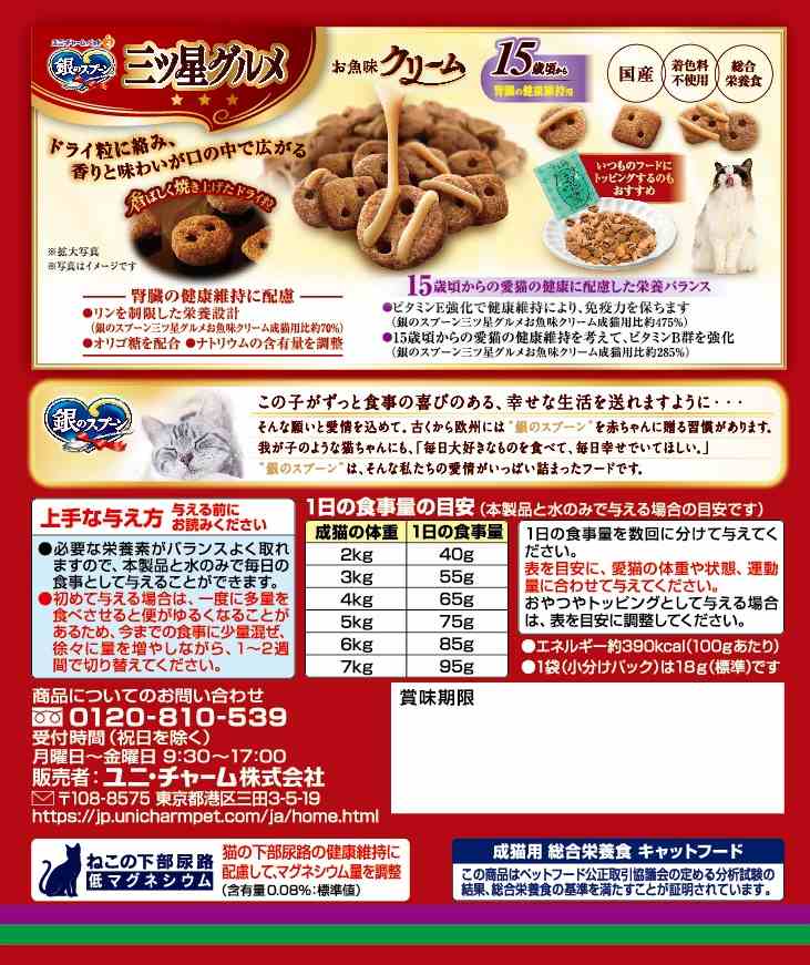 ・ドライ粒にクリームを絡めて、今までにない味わいを実現 ・腎臓の健康維持に配慮して、リンを制限した栄養設計※ ・腎臓の健康維持に配慮して、ナトリウムの含有量を調整、オリゴ糖配合 ・ビタミンE強化で健康維持により、免疫力を保ちます※ ・猫の下部尿路の健康維持に配慮して、マグネシウム量を調整(含有量0.08%:標準値) ※銀のスプーン三ツ星グルメお魚味クリーム成猫用比