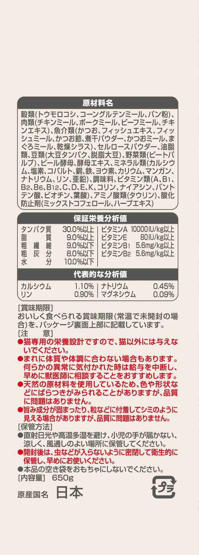 原材料穀類(トウモロコシ、パン粉、コーングルテンミール)、肉類(チキンミール、ポークミール、ビーフミール、チキンエキス)、魚介類(かつお、フィッシュエキス、フィッシュミール、かつお節、煮干パウダー、かつおミール、まぐろミール、乾燥シラス)、セルロースパウダー、油脂類、豆類(大豆タンパク、脱脂大豆)、野菜類(ビートパルプ)、ビール酵母、酵母エキス、ミネラル類(カルシウム、塩素、コバルト、銅、鉄、ヨウ素、カリウム、マンガン、ナトリウム、リン、亜鉛)、アミノ酸類(タウリン、メチオニン)、ビタミン類(A、B1、B2、B6、B12、C、D、E、K、コリン、ナイアシン、パントテン酸、ビオチン、葉酸)、酸化防止剤(ミックストコフェロール、ハーブエキス)