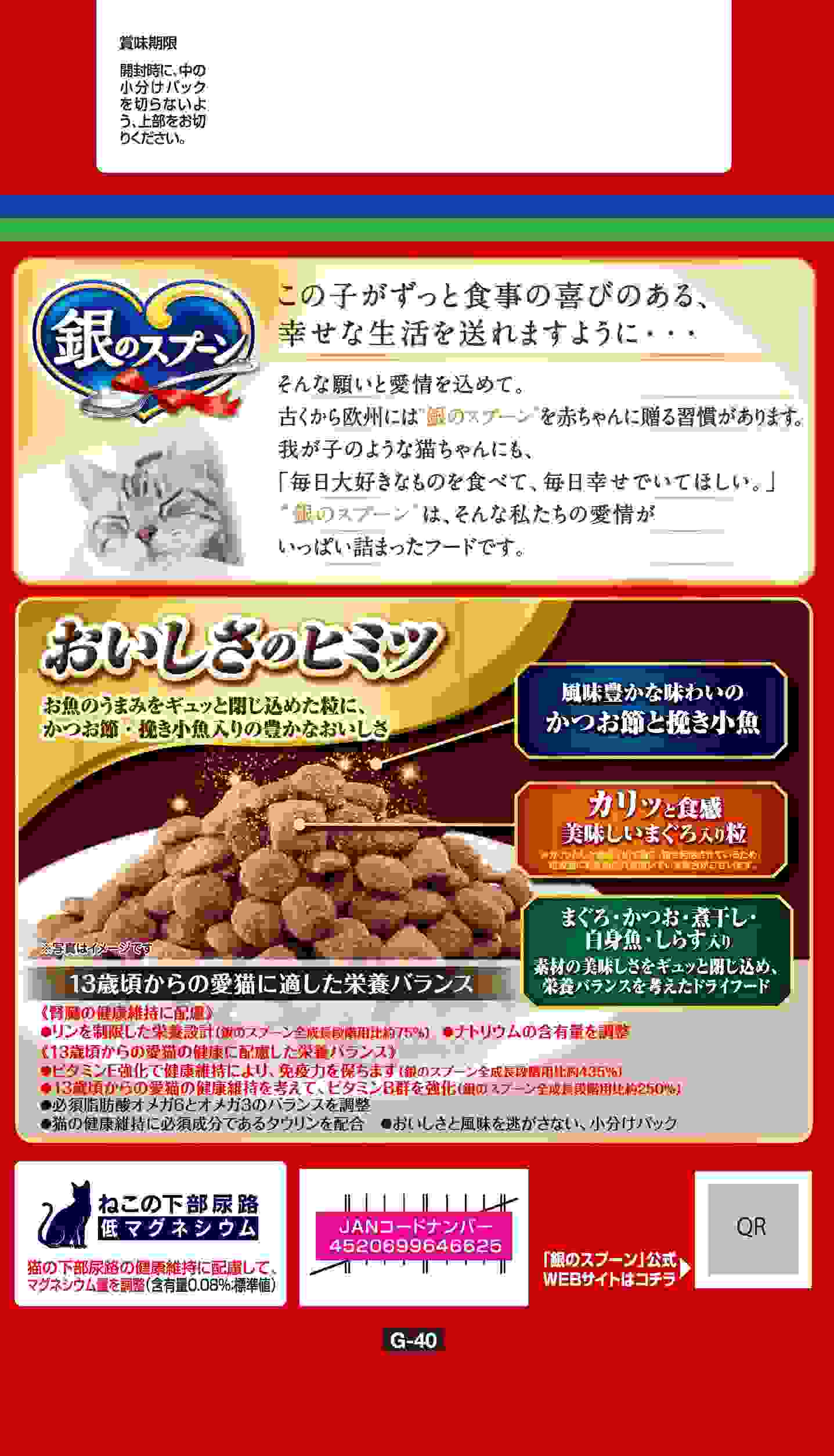 ・お魚のうまみたっぷりの贅沢うまみ仕立て・カリッと食感のおいしいまぐろ入り粒入り・腎臓の健康維持に配慮して、リンを制限した栄養設計※・腎臓の健康維持に配慮して、ナトリウムの含有量を調整・ビタミンEを強化した総合栄養食なので、健康を維持し、免疫力をサポートします※・ねこの下部尿路の健康維持に配慮して、マグネシウム量を調整(含有量0.08%:標準値)※銀のスプーン全成長段階用比