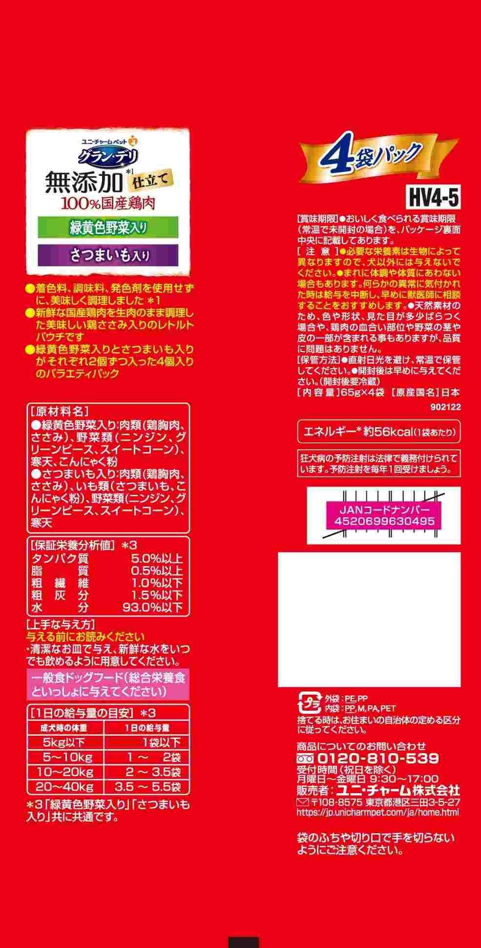 ・着色料・調味料・発色剤を使用せずに、美味しく調理しました ・良質な国産鶏肉を生肉のまま調理した美味しい鶏ささみ入りのレトルトパウチです ・緑黄色野菜入りとさつまいも入りがそれぞれ2個ずつ入った嬉しいアソート4個パック