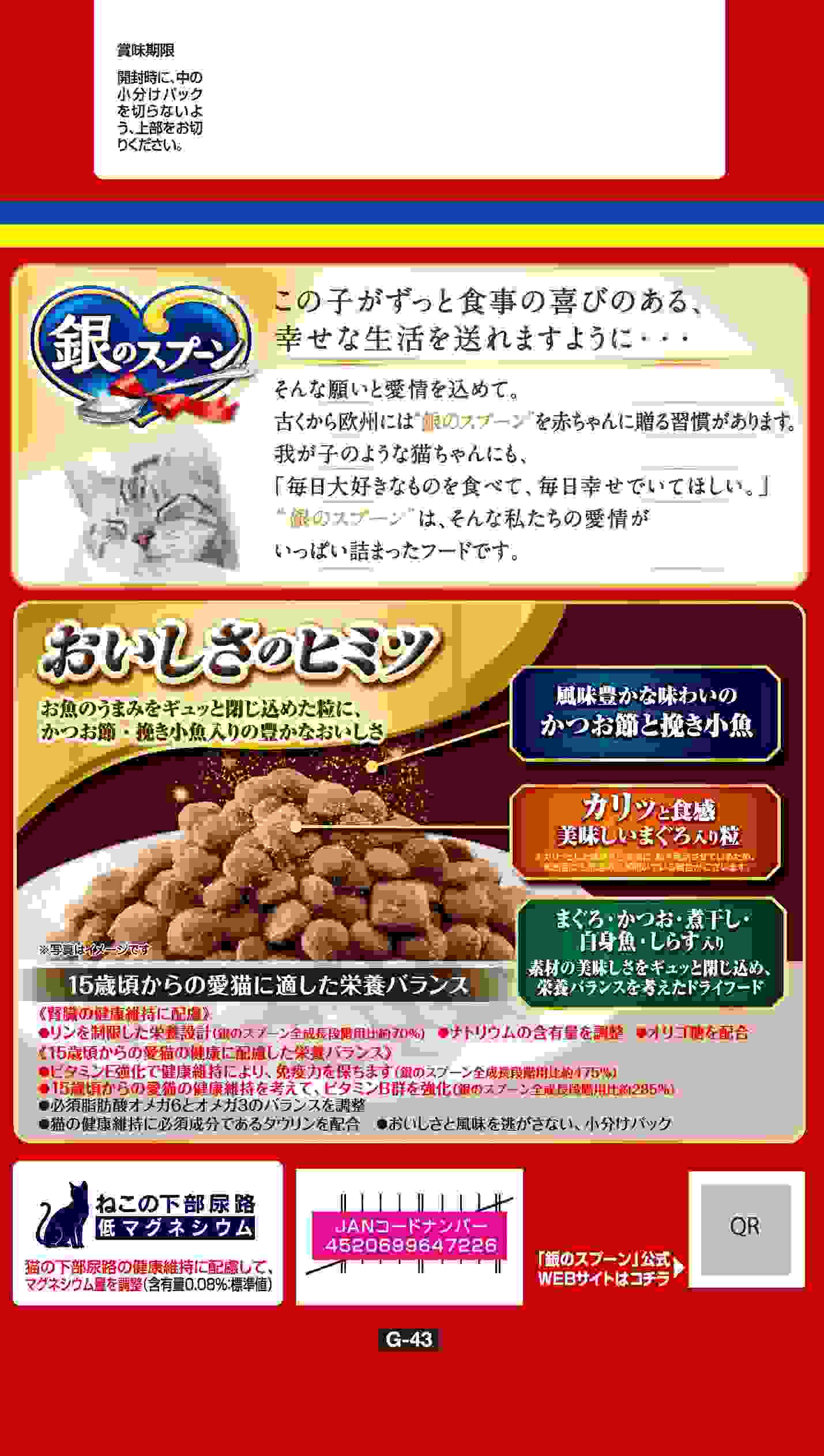 お魚本来のうまみをギュッと閉じ込め、猫ちゃんが夢中で食べてくれる美味しさのドライフードです。・お魚のうまみたっぷりの贅沢うまみ仕立て・カリッと食感のおいしいまぐろ入り粒が入って、最後のひとくちまで夢中のグルメフード・腎臓の健康維持に配慮して、リンを制限した栄養設計(銀のスプーン13歳比約90%)