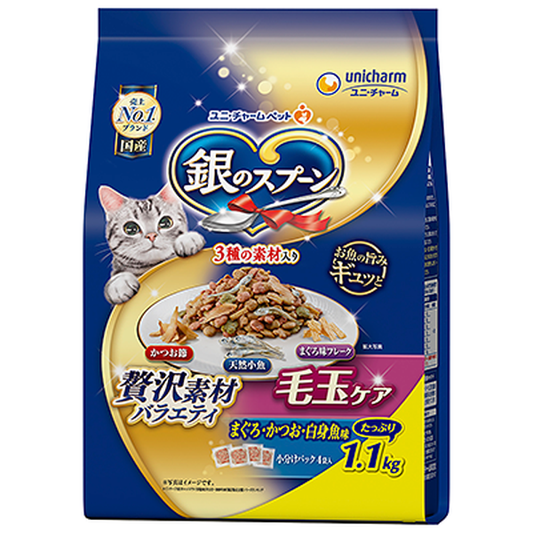 -商品特徴-●お魚のうまみをたっぷり閉じ込めた粒に、天然小魚やかつお節、まぐろ味フレークをミックスしたバラエティ豊かなおいしさ●毛づくろい等で飲み込んでしまった毛の排泄を助けるために、食物繊維配合●ねこの下部尿路の健康維持に配慮して、マグネシウム量を調整(含有量0.08%:標準値)