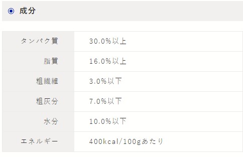 【原材料】穀類(トウモロコシ、小麦粉、コーングルテンミール、パン粉)、肉類(ビーフミール、チキンミール、ポークミール、チキンエキス)、油脂類、魚介類(フィッシュエキス、フィッシュミール、まぐろミール、かつお節、煮干パウダー、白身魚ミール、乾燥シラス)、ビール酵母、酵母エキス、ミネラル類(カルシウム、塩素、コバルト、銅、鉄、ヨウ素、カリウム、マンガン、リン、亜鉛)、調味料、ビタミン類(A、B1、B2、B6、B12、C、D、E、K、コリン、ナイアシン、パントテン酸、ビオチン、葉酸)、着色料(二酸化チタン、赤色102号、赤色106号、黄色4号、黄色5号)、アミノ酸類(タウリン)、酸化防止剤(ミックストコフェロール、ハーブエキス)