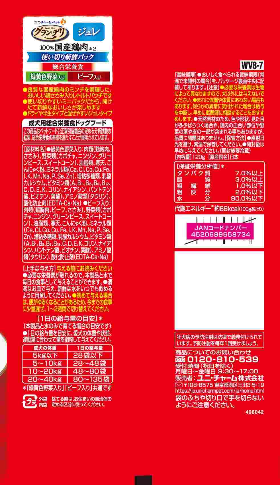 ・ウェットタイプの成犬用の総合栄養食ドッグフード・1回で使い切れるから、毎回開けたての美味しさを楽しめる・100%国産の良質な鶏肉を調理・美味しい鶏ささみ入りレトルトパウチ・ドライタイプとソフトタイプのフードと混ぜやすいジュレタイプ・緑黄色野菜入りとビーフ入りがそれぞれ4袋ずつ入った嬉しいアソート8袋パック