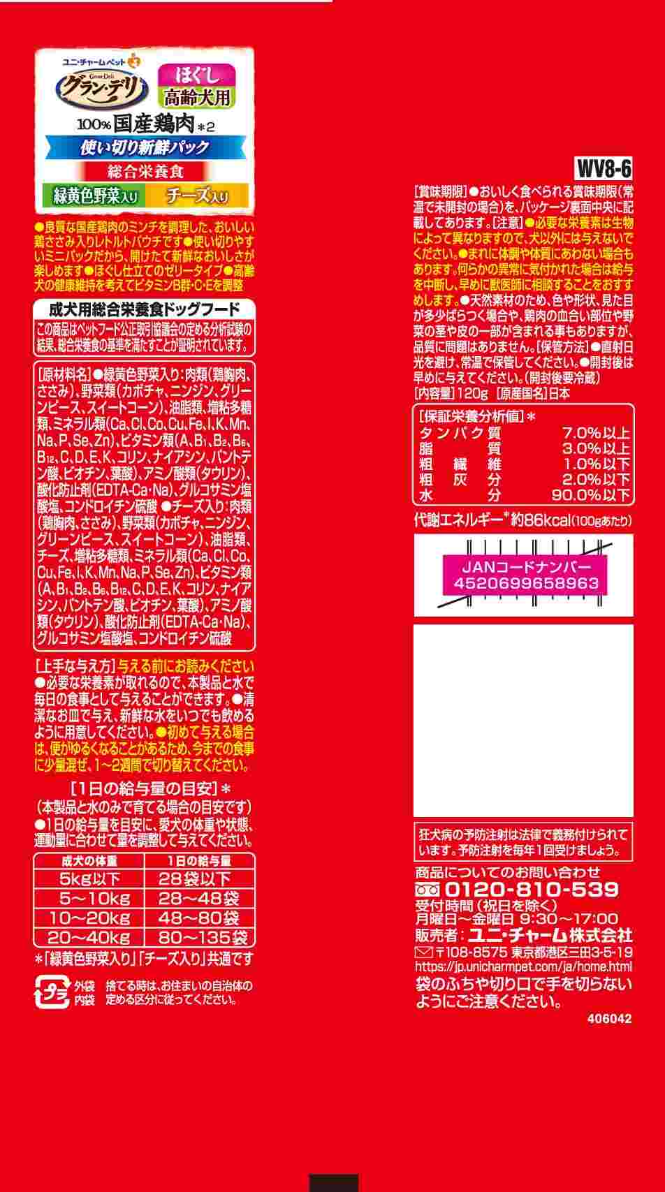 ・ウェットタイプの高齢犬用の総合栄養食ドッグフード・1回で使い切れるから、毎回開けたての美味しさを楽しめる・100%国産の良質な鶏肉を調理・美味しい鶏ささみ入りレトルトパウチ・愛犬が大好きなほぐし仕立てのゼリータイプ・高齢犬の健康維持を考えてビタミンB群・C・Eを調整・緑黄色野菜入りとチーズ入りがそれぞれ4袋ずつ入った嬉しいアソート8袋パック