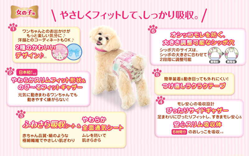 ◆「マナーウェア 女の子用」は、そそう・生理にも安心、洋服みたいな吸収ウェアです ◆ お出かけ・お部屋でのそそう・生理に安心!旅行、ドライブ、お散歩に ◆ 洋服感覚、2種のおしゃれなデザイン ◆ 「やわらかスリムフィット形状」で、嫌がらない ◆ 「やわらか全面通気シート」で、お肌さらさら ◆ 「ぴったりサイドギャザー」で、すきまモレ安心 ◆ 「安心スリム吸収体」で、6時間分のおしっこを吸収 ※健康なワンちゃんの6時間の平均おしっこ量を参考 (ワンちゃんのおしっこ量には個体差があります)