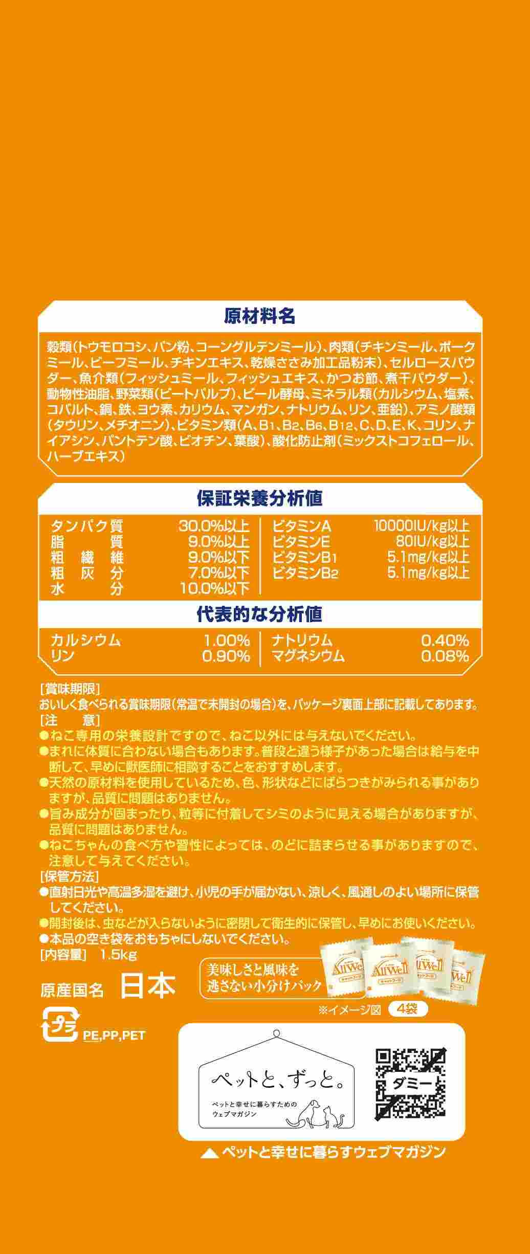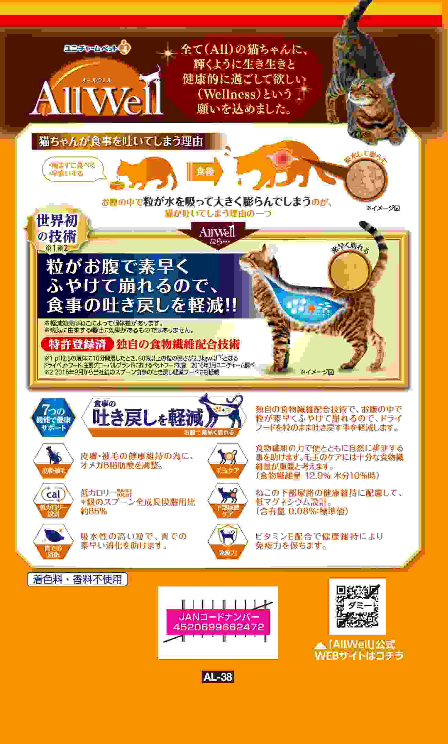 ・食事の吐き戻し軽減を中心とした7つの機能で健康サポート。・ねこがゆっくり食べることに配慮した粒形状で、ねこの早食いをケア。・大きさや厚みにこだわった丸十字形状の粒で、ねこがよく噛むことに配慮。・猫が大好きなチキンの旨みが詰まった粒に、挽き小魚と微粉砕したささみフリーズドライをまぶした高い嗜好性。 ・着色料・香料不使用。
