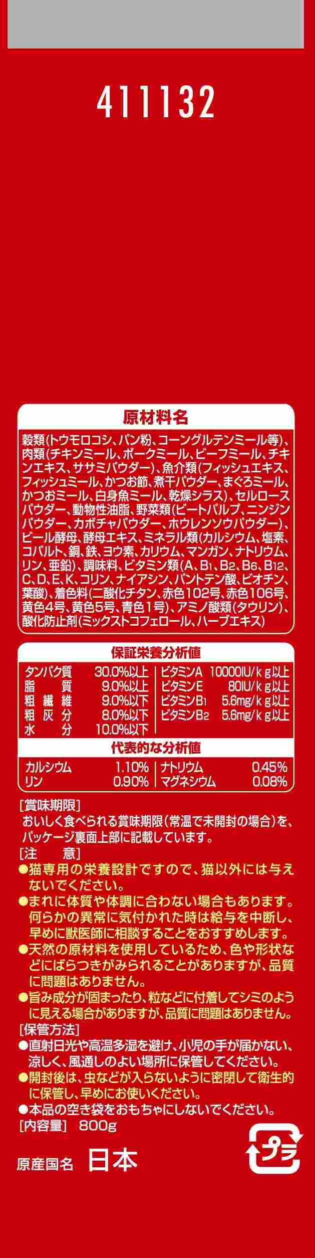原材料穀類(トウモロコシ、パン粉、コーングルテンミール等)、肉類(チキンミール、ポークミール、ビーフミール、チキンエキス、ササミパウダー)、魚介類(フィッシュミール、フィッシュエキス、かつお節、煮干パウダー、まぐろミール、かつおミール、白身魚ミール、乾燥シラス)、セルロースパウダー、動物性油脂、野菜類(ビートパルプ、ニンジンパウダー、カボチャパウダー、ホウレンソウパウダー)、ビール酵母、酵母エキス、ミネラル類(カルシウム、塩素、コバルト、銅、鉄、ヨウ素、カリウム、マンガン、リン、亜鉛)、アミノ酸類(タウリン、メチオニン)、ビタミン類(A、B1、B2、B6、B12、C、D、E、K、コリン、ナイアシン、パントテン酸、ビオチン、葉酸)、着色料(二酸化チタン、赤色102号、赤色106号、黄色4号、黄色5号、青色1号)、酸化防止剤(ミックストコフェロール、ハーブエキス)
