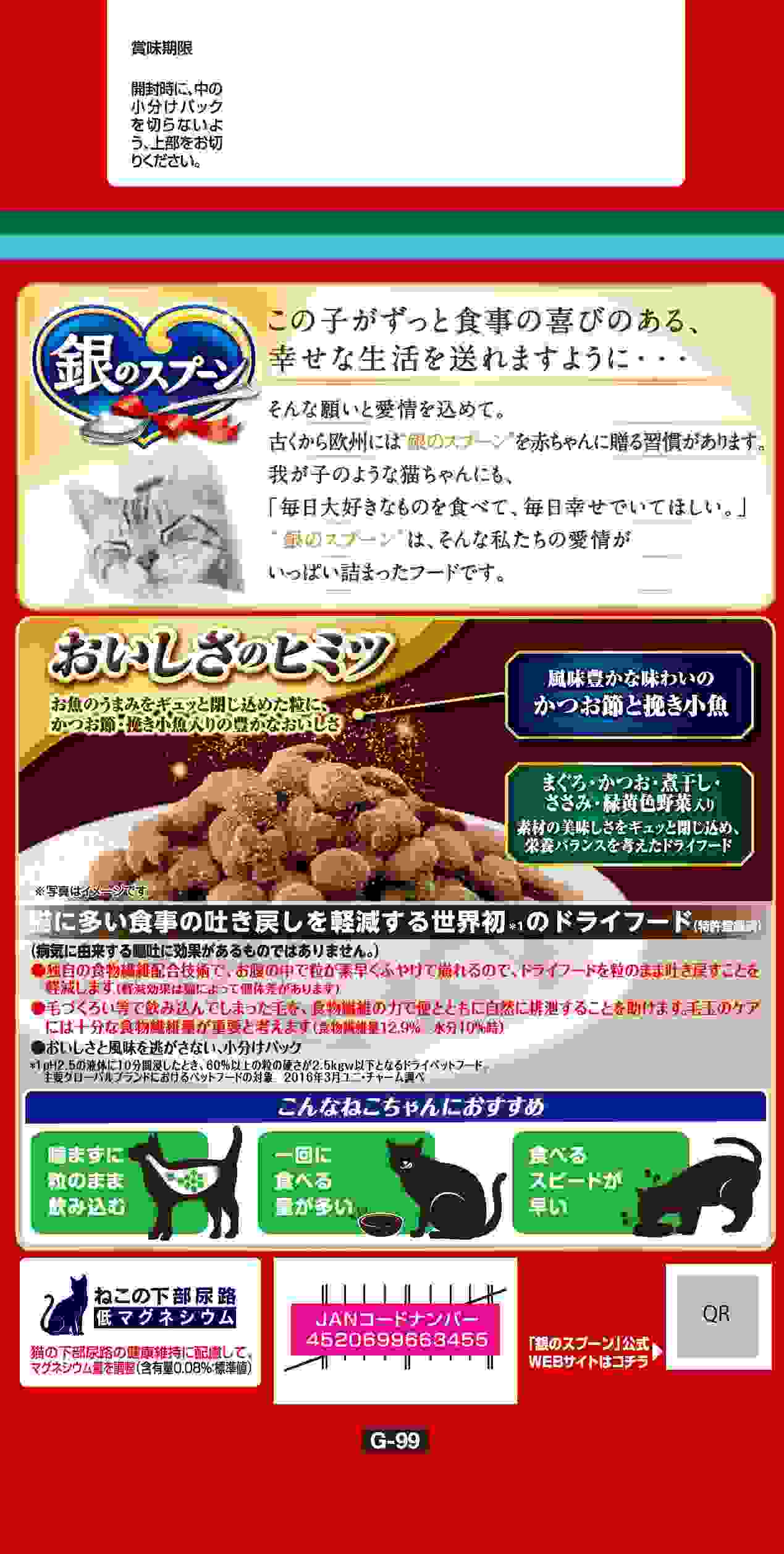 使用上の注意●猫専用の栄養設計ですので、猫以外には与えないでください。●まれに体質や体調に合わない場合もあります。何らかの異常に気付かれた時は給与を中断し、早めに獣医師に相談することをおすすめします。●天然の原材料を使用しているため、色や形状などにばらつきがみられることがありますが、品質に問題はありません。●旨み成分が固まったり、粒などに付着してシミのように見える場合がありますが、品質に問題はありません。