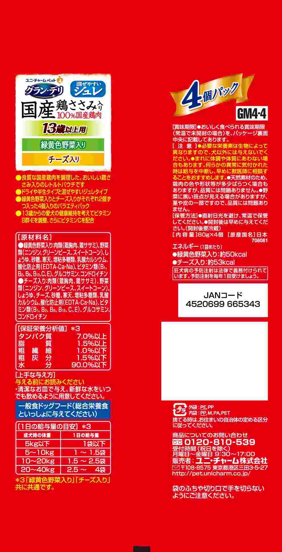 ・100%国産の良質な鶏肉を調理・美味しい鶏ささみ入りレトルトパウチ・ドライタイプやソフトタイプのフードと混ぜやすいジュレタイプ・緑黄色野菜入りとチーズ入りがそれぞれ2個ずつ入った、嬉しいアソート4個パック・13歳からの愛犬の健康維持を考えて、ビタミンB群・Eを調整