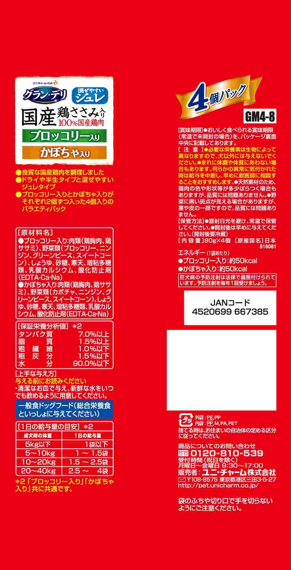 ・100%国産の良質な鶏肉を調理 ・美味しい鶏ささみ入りレトルトパウチ ・ドライタイプやソフトタイプのフードと混ぜやすいジュレタイプ ・ブロッコリー入りとかぼちゃ入りがそれぞれ2個ずつ入った、嬉しいアソート4個パック