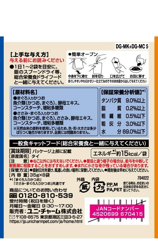 ●まぐろ入りかつお:魚介類(かつお、まぐろ)、酵母エキス、コーンスターチ、増粘多糖類●ささみ・まぐろ入りかつお:魚介類(かつお、まぐろ)、ささみ、酵母エキス、コーンスターチ、増粘多糖類※天然由来の原料を使用しているため、色・形・大きさは多少ばらつく場合がありますが、品質には問題ありません。