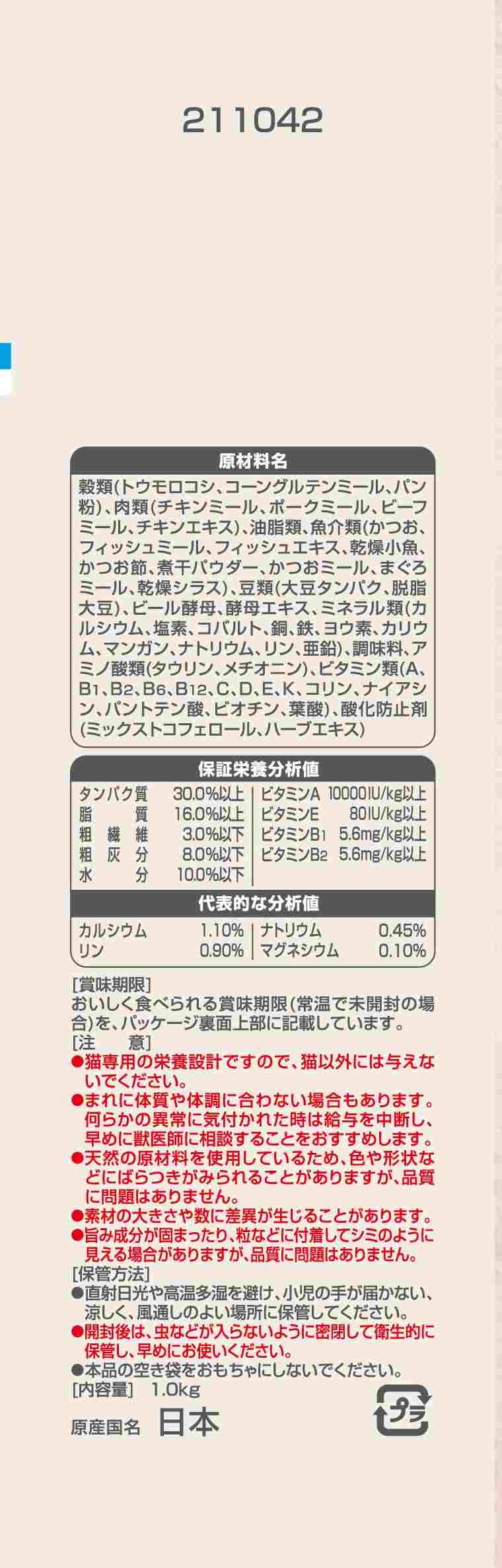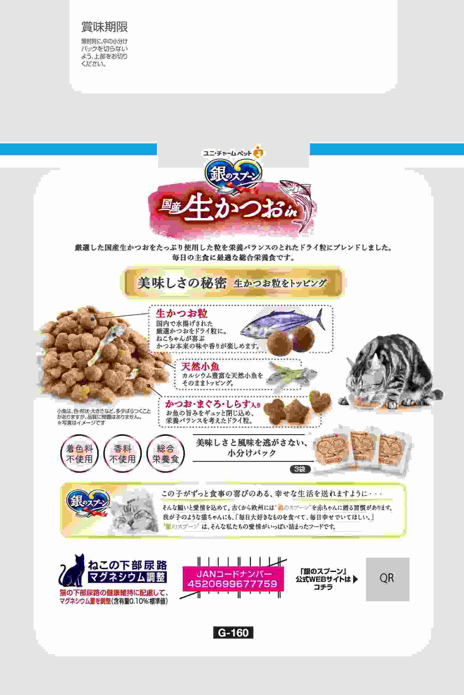 ・国内で水揚げされた厳選生かつおをドライ粒にし、栄養バランスを考えた粒にブレンドしました。・猫の下部尿路の健康維持に配慮して、マグネシウム量を調整(含有量0.10%:標準値)・カルシウム豊富な天然小魚をそのままトッピング・国産、着色料・香料不使用。