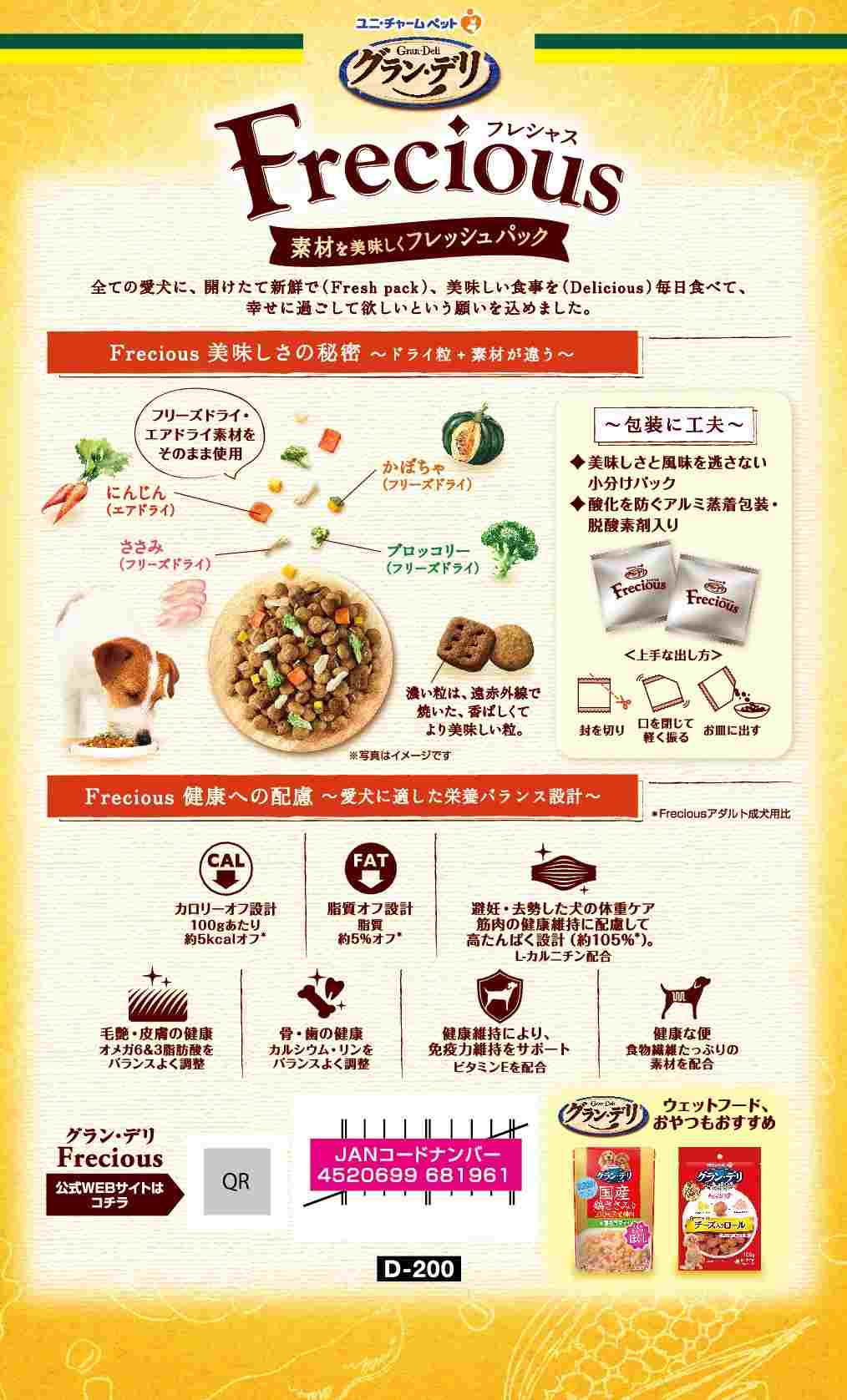素材を美味しくフレッシュパックした国産プレミアムドッグフードです。遠赤外線で焼き上げた粒とフリーズドライ・エアドライの素材を酸化を防ぐ鮮度維持包装をすることで、いつでも美味しくワンちゃんが喜びます。避妊・去勢後の愛犬の筋肉の健康維持に配慮した高たんぱく設計。(Freciousアダルト成犬用比)Lーカルニチン配合。カロリーオフ設計。脂質オフ設計。(Freciousアダルト成犬用比)