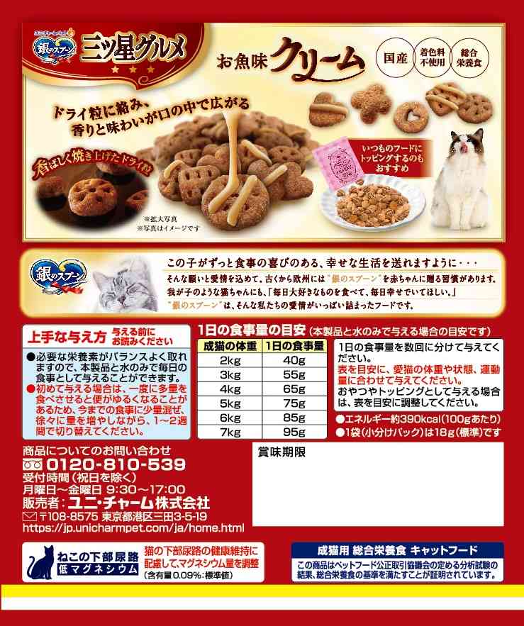 使用上の注意●猫専用の栄養設計ですので、猫以外には与えないでください。●まれに体質や体調に合わない場合もあります。何らかの異常に気付かれた時は給与を中断し、早めに獣医師に相談することをおすすめします。●天然の原材料を使用しているため、色や形状などにばらつきがみられることがありますが、品質に問題はありません。●旨み成分が固まったり、粒やクリームなどに付着してシミのように見える場合がありますが、品質に問題はありません。●製品の特性上、クリームがかかっていない粒やクリームがはがれている場合がありますが、品質に問題はありません。