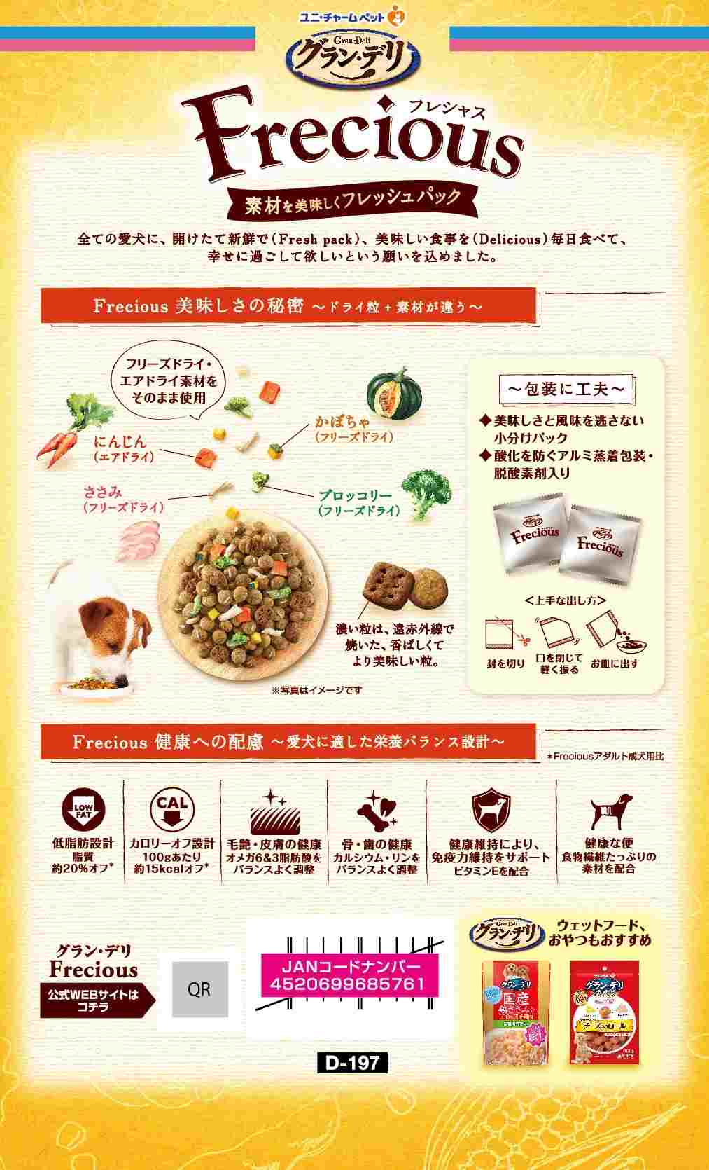 素材を美味しくフレッシュパックした国産プレミアムドッグフードです。遠赤外線で焼き上げた粒とフリーズドライ・エアドライの素材を、酸化を防ぐ鮮度維持包装をすることで、いつでも美味しくワンちゃんが喜びます。体重が気になる愛犬向けの低脂肪設計で、愛犬が大好きなチキン&小魚入りです。