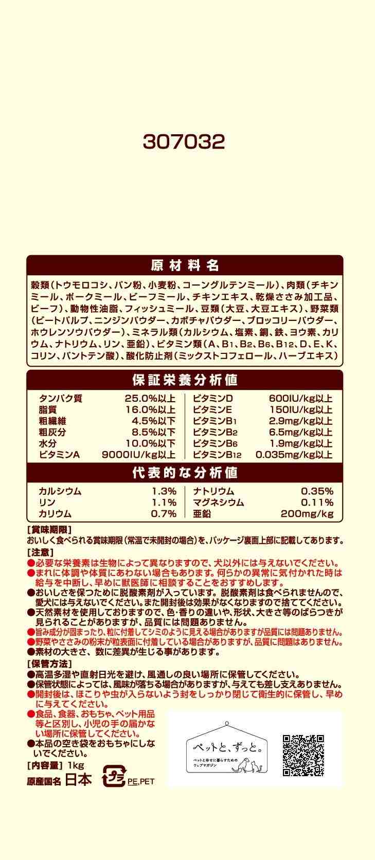 原材料穀類(トウモロコシ、パン粉、小麦粉、コーングルテンミール)、肉類(チキンミール、ポークミール、ビーフミール、チキンエキス、乾燥ささみ加工品、ビーフ)、動物性油脂、フィッシュミール、豆類(大豆、大豆エキス)、野菜類(ビートパルプ、ニンジンパウダー、カボチャパウダー、ブロッコリーパウダー、ホウレンソウパウダー)、ミネラル類(カルシウム、塩素、銅、鉄、ヨウ素、カリウム、ナトリウム、リン、亜鉛)、ビタミン類(A、B1、B2、B6、B12、D、E、K、コリン、パントテン酸)、酸化防止剤(ミックストコフェロール、ハーブエキス)