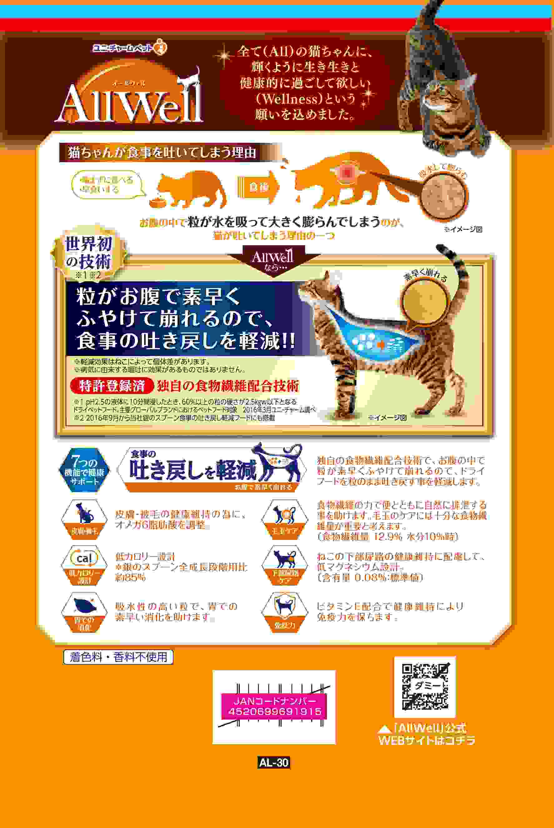 ・食事の吐き戻し軽減を中心とした7つの機能で健康サポート。・ねこがゆっくり食べることに配慮した粒形状で、ねこの早食いをケア。・大きさや厚みにこだわった丸十字形状の粒で、ねこがよく噛むことに配慮。・猫が大好きなフィッシュの旨みが詰まった粒に、挽き小魚と微粉砕したささみフリーズドライをまぶした高い嗜好性。 ・着色料・香料不使用。