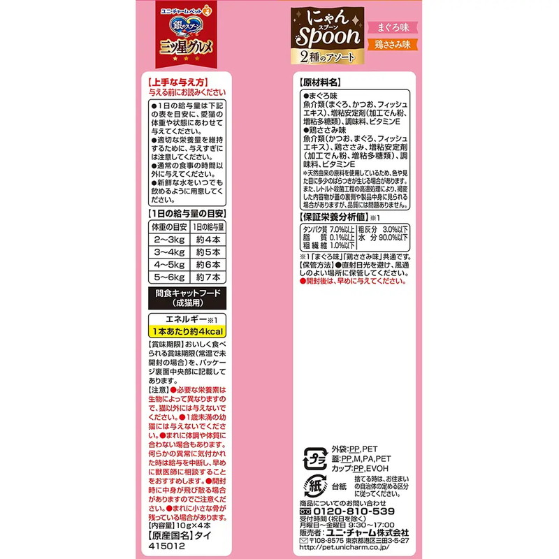 ・お魚をすりつぶした、とろ~りウェットタイプのおやつです ・こぼれにくくて、ねこちゃんが食べやすいスプーンタイプ ・10gで食べきりサイズ ・無着色 ・ひと袋に2種類の味が詰まったアソートタイプ 【ご注意】 ・必要な栄養素は生物によって異なりますので、猫以外には与えないでください。 ・1歳未満の幼猫には与えないでください。 ・適切な栄養量を維持するために、与えすぎにはご注意ください。 ・開封時に中身が飛び散る場合がありますのでご注意ください。 ・まれに小さな骨が残っている場合があります。