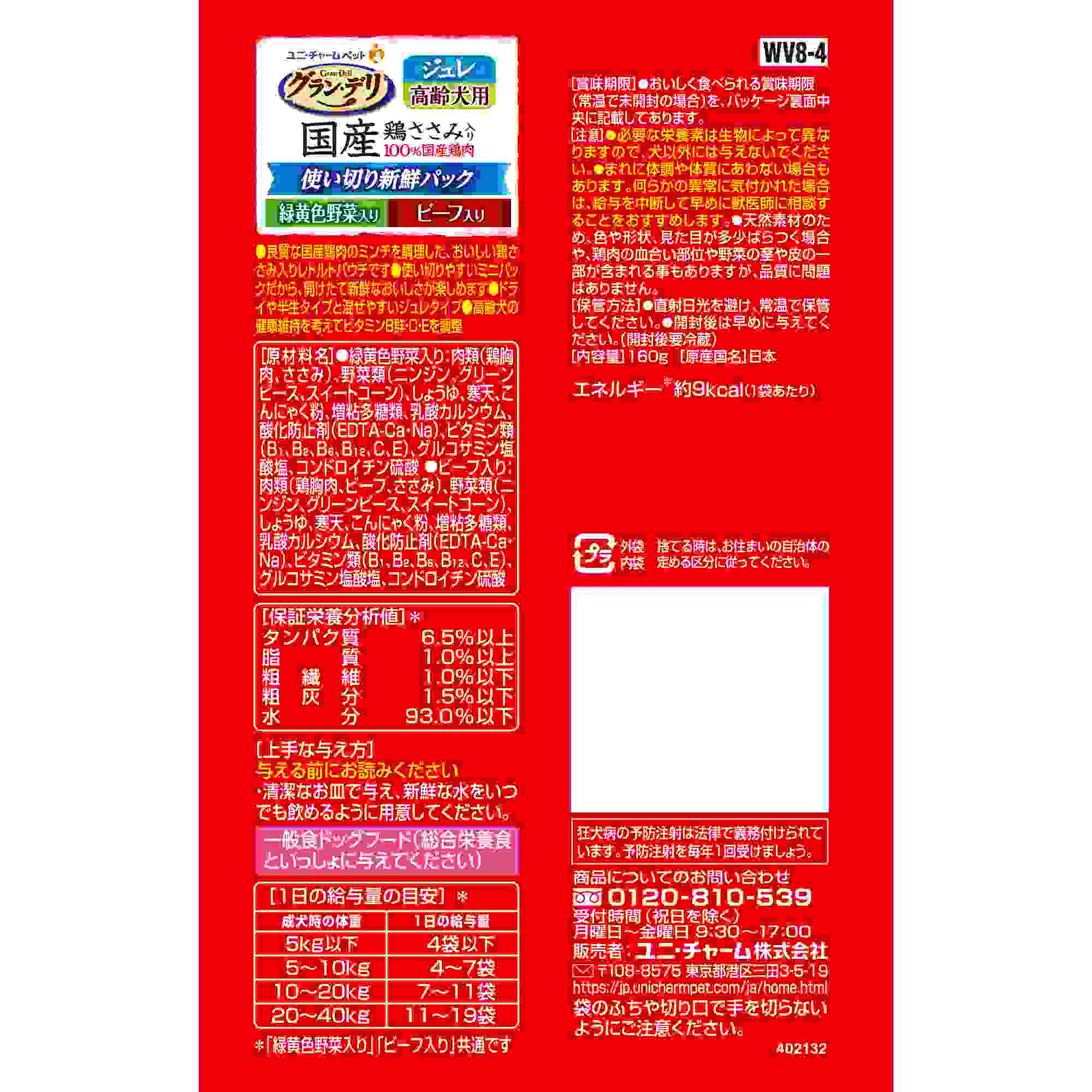 ・1回で使い切れるから、毎回開けたての美味しさを楽しめる ・100%国産の良質な鶏肉を調理 ・美味しい鶏ささみ入りレトルトパウチ ・ドライタイプとソフトタイプのフードと混ぜやすいジュレタイプ ・高齢犬の健康維持を考えてビタミンB群・C・Eを調整 ・緑黄色野菜入りとビーフ入りがそれぞれ4個ずつ入った嬉しいアソート8個パック