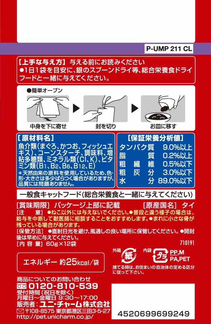 魚介類(まぐろ、かつお、フィッシュエキス)、コーンスターチ、調味料、増粘多糖類、ミネラル類(Cl、K)、ビタミン類(B1、B2、B6、B12、E)※天然由来の原料を使用しているため、色・形・大きさは多少ばらつく場合がありますが、品質には問題ありません。