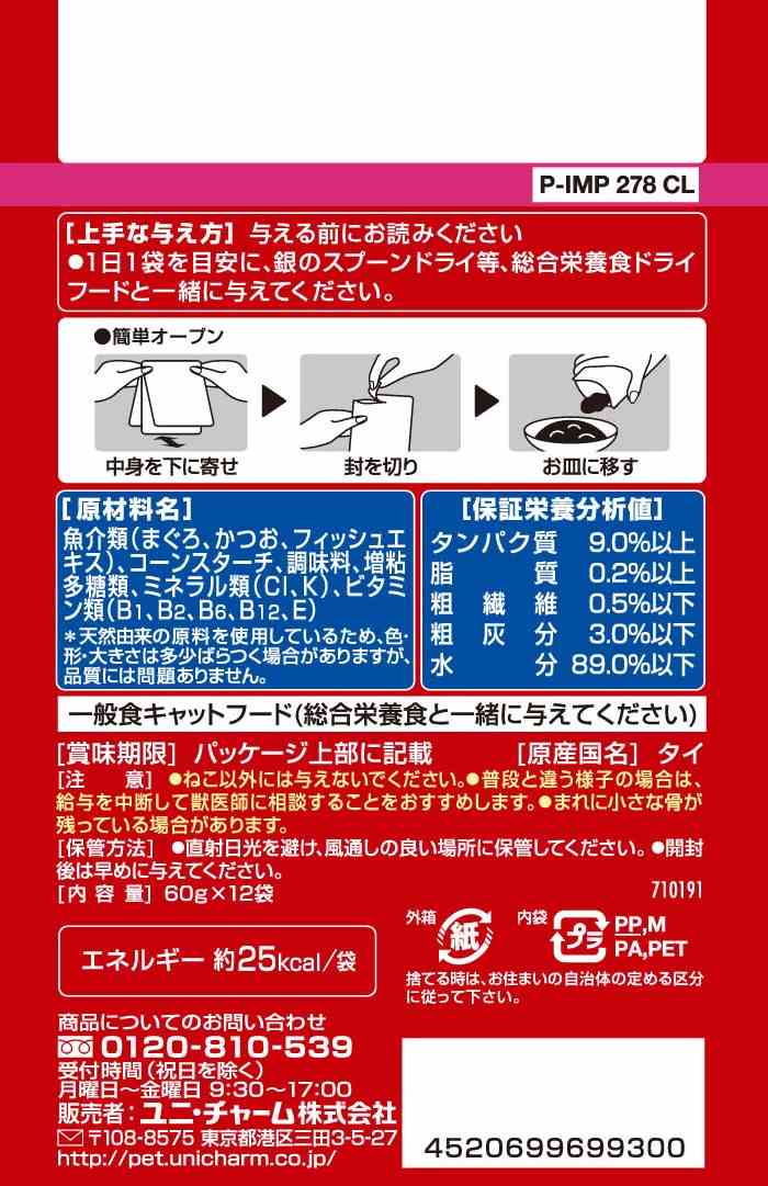 魚介類(まぐろ、かつお、フィッシュエキス)、コーンスターチ、調味料、増粘多糖類、ミネラル類(Cl、K)、ビタミン類(B1、B2、B6、B12、E)※天然由来の原料を使用しているため、色・形・大きさは多少ばらつく場合がありますが、品質には問題ありません。