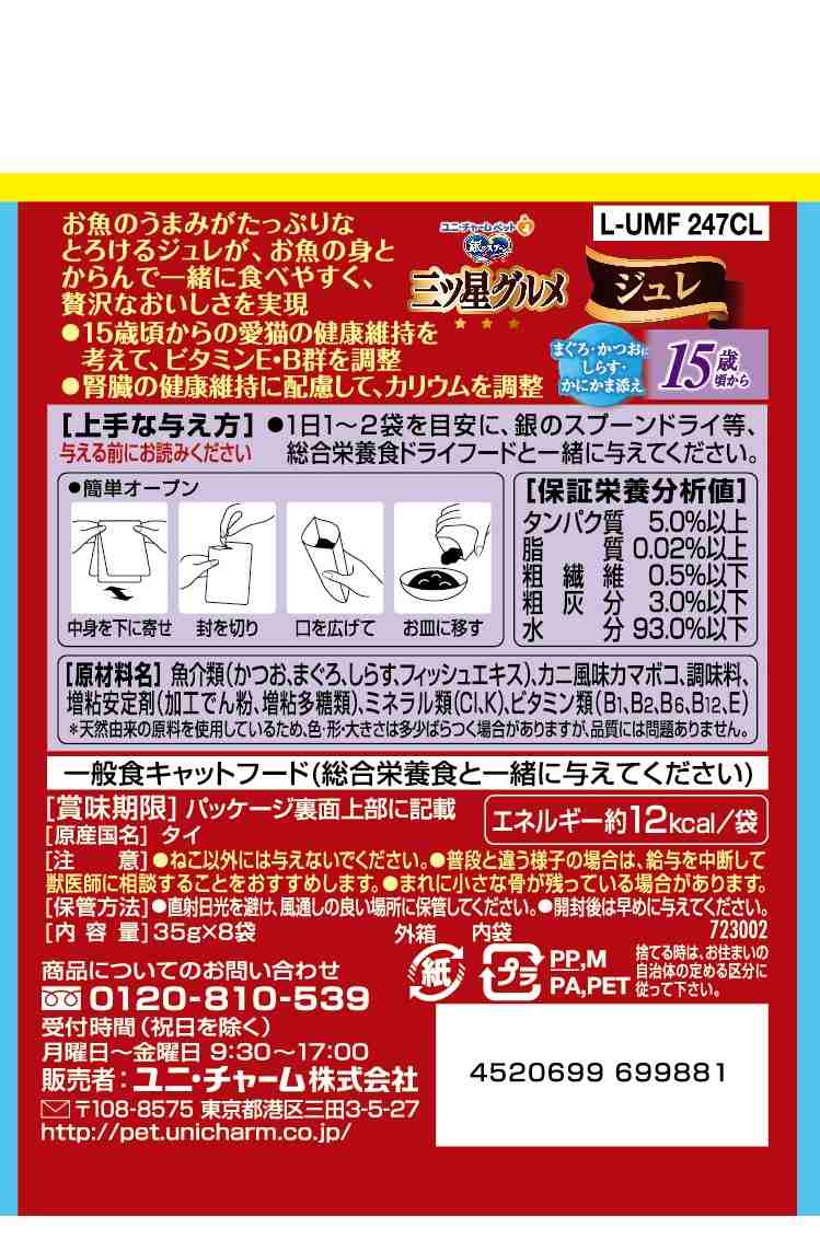 ・具と一緒に味わう贅沢な美味しさ ・お魚のうまみがたっぷりなとろけるジュレが、お魚の身とからんで一緒に食べやすく、贅沢なおいしさを実現。 ・15歳頃からの愛猫の健康維持を考えて、ビタミンE・B群を調整 ・腎臓の健康維持に配慮して、カリウムを調整 ・8袋入り