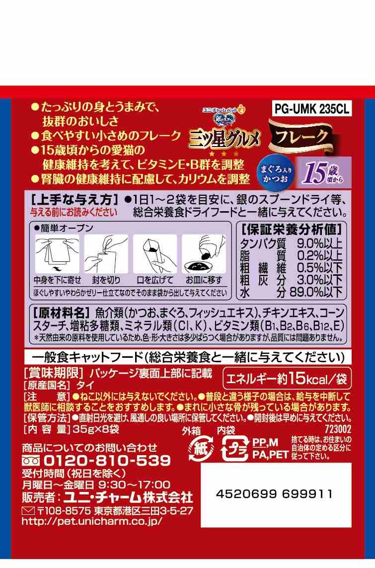 ・たっぷりの身とうまみで、抜群のおいしさを実現。 ・15歳頃からの愛猫の健康維持を考えて、ビタミンE・B群を調整。 ・腎臓の健康維持に配慮して、カリウムを調整。 ・食べやすい小さめのフレーク・ほぐしやすいやわらかゼリー仕立て ・8袋入り