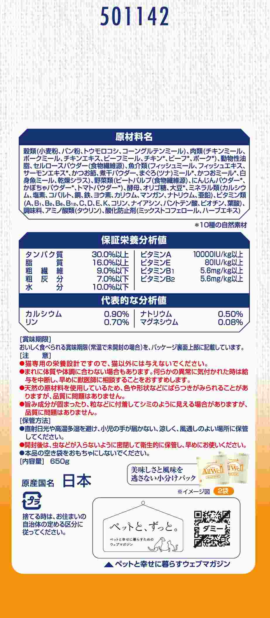 使用上の注意●猫専用の栄養設計ですので、猫以外には与えないでください。●まれに体質や体調に合わない場合もあります。何らかの異常に気付かれた時は給与を中断し、早めに獣医師に相談することをおすすめします。●天然の原材料を使用しているため、色や形状などにばらつきがみられることがありますが、品質に問題はありません。●旨み成分が固まったり、粒などに付着してシミのように見える場合がありますが、品質に問題はありません。