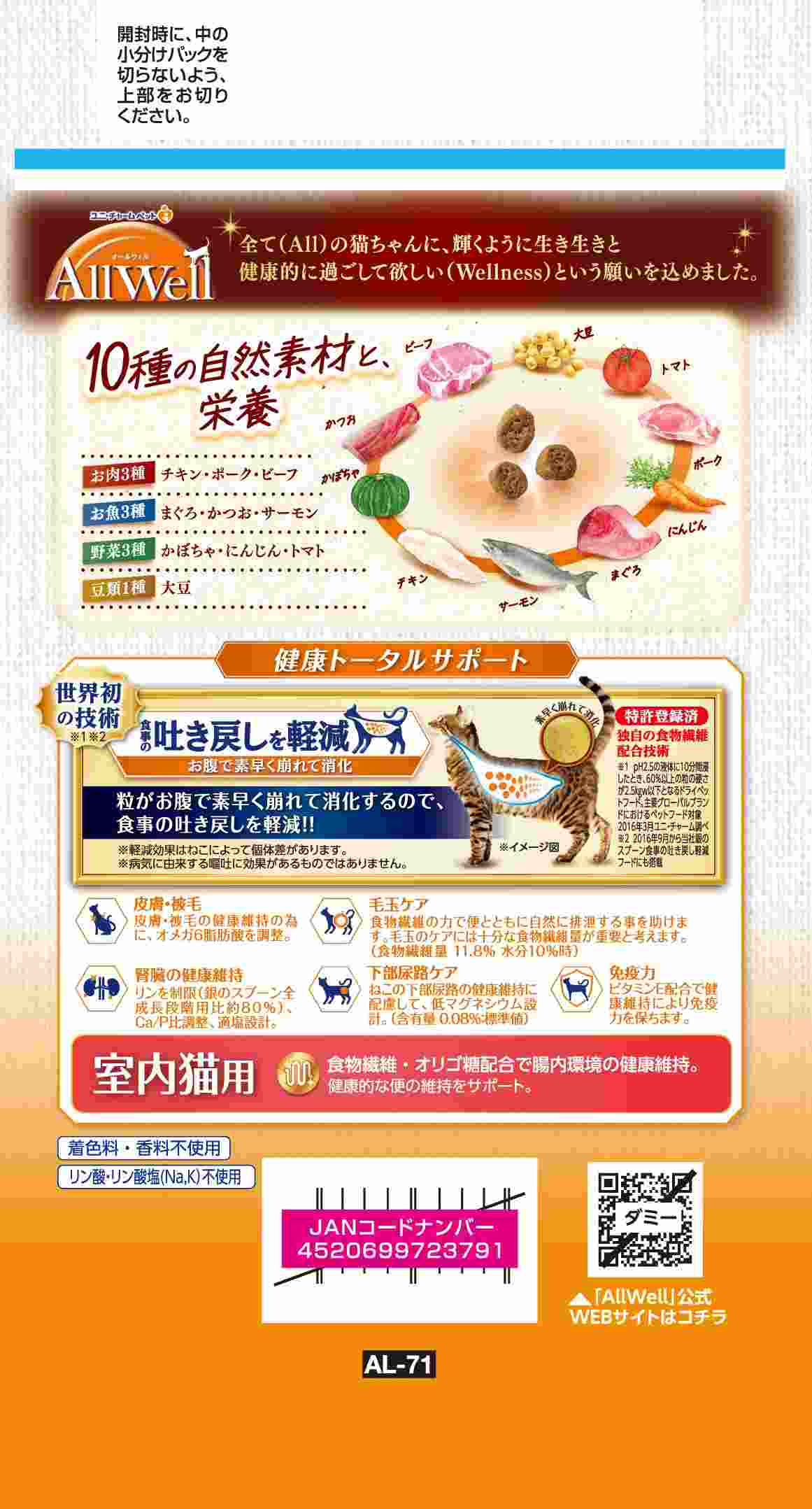・食事の吐き戻しを軽減し、10種の自然素材と栄養を! ・10種の自然素材 チキン・ポーク・ビーフ/まぐろ・かつお・サーモン/かぼちゃ・にんじん・トマト/大豆 配合。 ・食物繊維・オリゴ糖配合で腸内環境の健康維持。 健康的な便の維持をサポート。 ・猫が大好きなサーモンとツナの旨みが詰まった粒に、挽き小魚をまぶした高い嗜好性