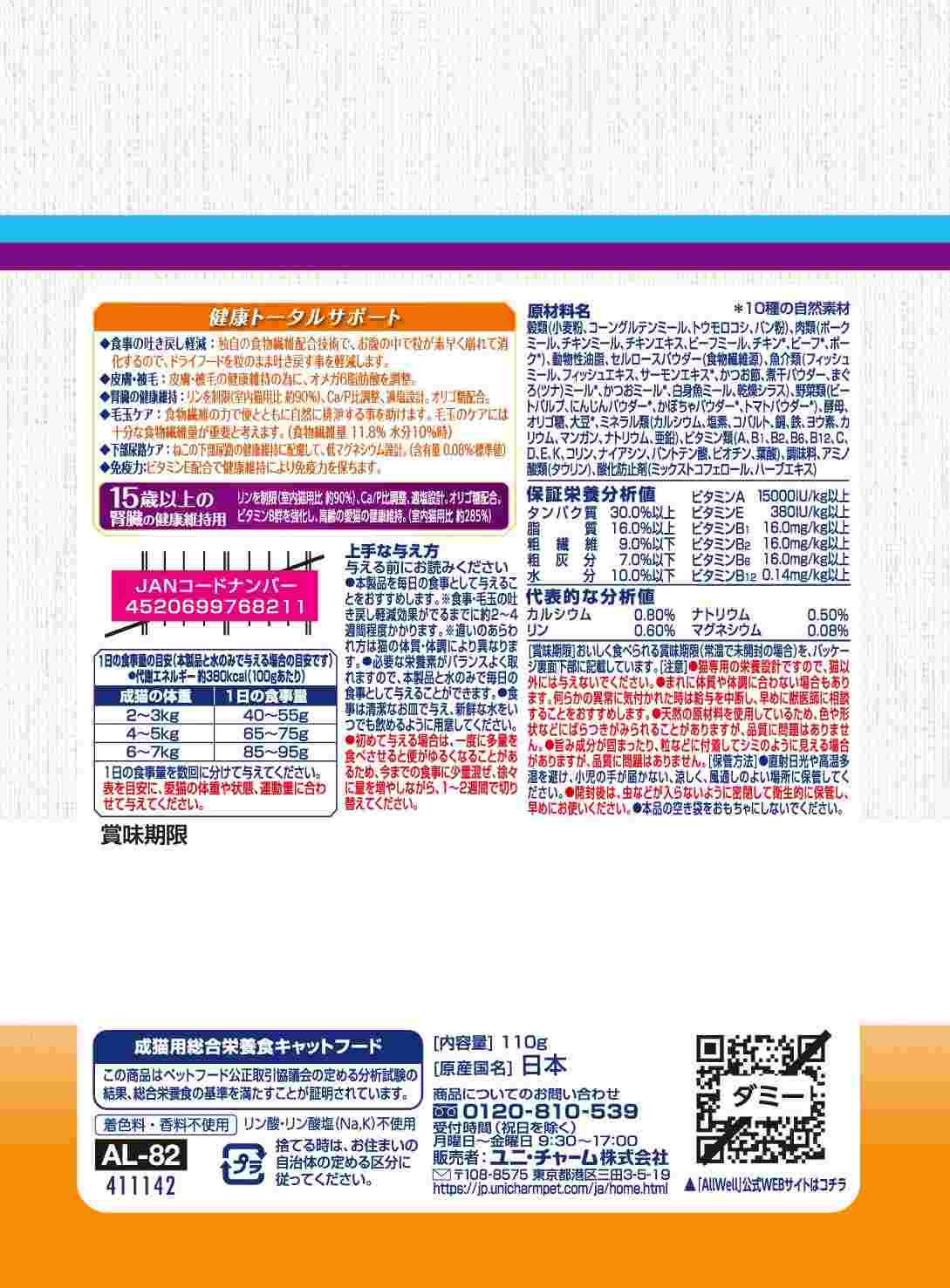 ・食事の吐き戻しを軽減し、10種の自然素材と栄養を! ・10種の自然素材 チキン・ポーク・ビーフ/まぐろ・かつお・サーモン/かぼちゃ・にんじん・トマト/大豆 配合。 ・リンを制限(室内猫用比 約90%)、Ca/P比調整、適塩設計。オリゴ糖配合。 ビタミンB群を強化し、高齢の愛猫の健康維持。(室内猫用比 約285%) ・猫が大好きなサーモンとツナの旨みが詰まった粒に、挽き小魚をまぶした高い嗜好性