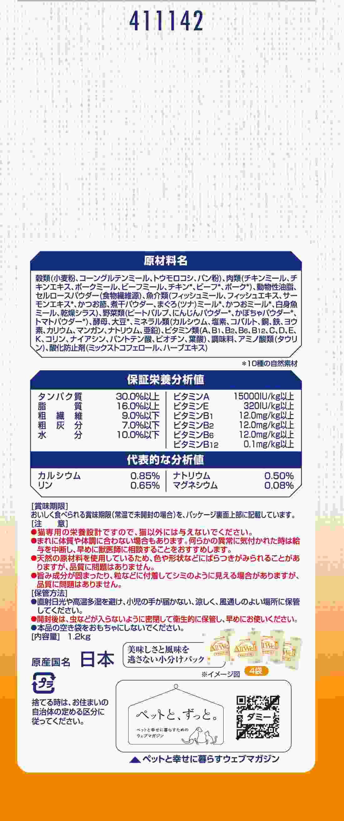 原材料穀類(小麦粉、コーングルテンミール、トウモロコシ、パン粉)、肉類(チキンミール、チキンエキス、ポークミール、ビーフミール、チキン*、ビーフ*、ポーク*)、動物性油脂、セルロースパウダー(食物繊維源)、魚介類(フィッシュミール、フィッシュエキス、サーモンエキス*、かつお節、煮干パウダー、まぐろ(ツナ)ミール*、かつおミール*、白身魚ミール、乾燥シラス)、野菜類(ビートパルプ、にんじんパウダー*、かぼちゃパウダー*、トマトパウダー*)、酵母、大豆*、ミネラル類(カルシウム、塩素、コバルト、銅、鉄、ヨウ素、カリウム、マンガン、ナトリウム、亜鉛)、ビタミン類(A、B1、B2、B6、B12、C、D、E、K、コリン、ナイアシン、パントテン酸、ビオチン、葉酸)、調味料、アミノ酸類(タウリン)、酸化防止剤(ミックストコフェロール、ハーブエキス)*10種の自然素材