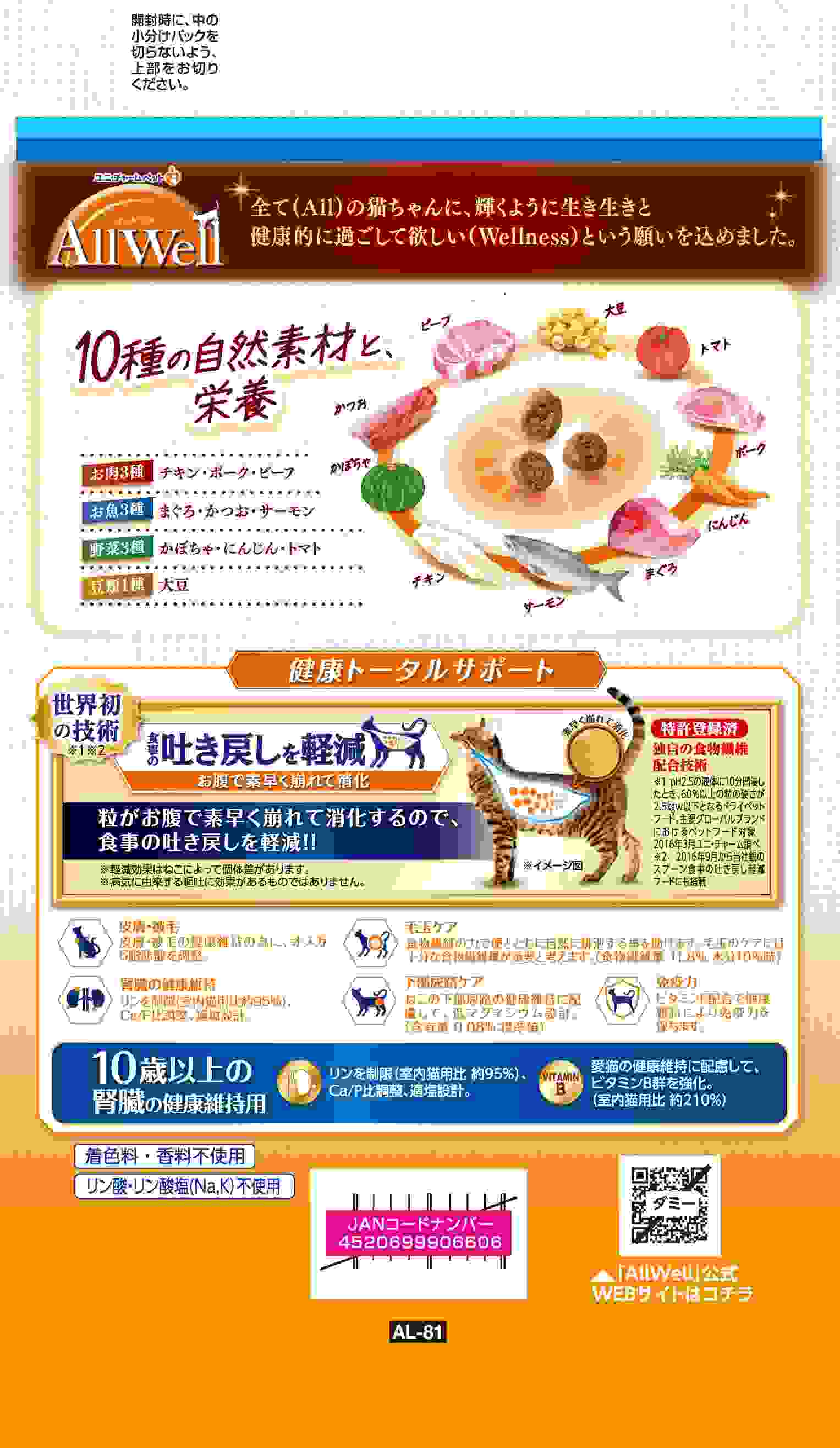 ・食事の吐き戻しを軽減し、10種の自然素材と栄養を! ・10種の自然素材 チキン・ポーク・ビーフ/まぐろ・かつお・サーモン/かぼちゃ・にんじん・トマト/大豆 配合。 ・リンを制限(室内猫用比 約95%)、Ca/P比調整、適塩設計。 愛猫の健康維持に配慮して、ビタミンB群を強化。(室内猫用比 約210%) ・猫が大好きなサーモンとツナの旨みが詰まった粒に、挽き小魚をまぶした高い嗜好性