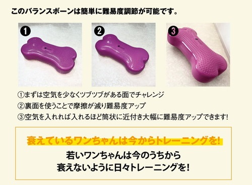 アンチバースト機能、滑り止めグリップ搭載!ボーン型バランスボール。・筋トレやリハビリに使用しやすい安定型・2本使うことで様々な応用も可能・空気量の調整で難易度を格段にアップ可能小型犬から大型犬まで幅広くご利用いただけます。ご使用の際は使用方法を良くご理解いただいた上で安全に正しくご利用ください。
