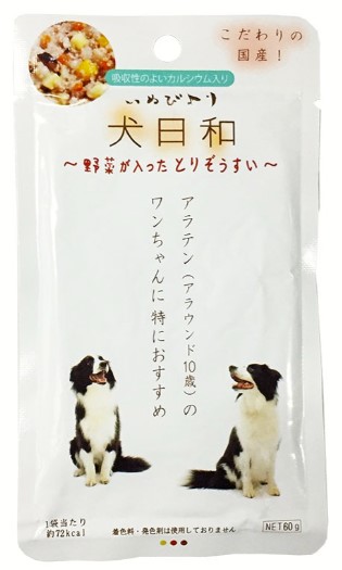 こだわりの国産!吸収性の良いカルシウム入りアラテン(アラウンド10歳)のワンちゃんに特におすすめ。着色料・発色剤は使用しておりません。<原材料>鶏肉、鶏ガラスープ、鶏レバー、白米、鶏卵管、にんじん、さつまいも、かぼちゃ、寒天、乳酸カルシウム<保証成分>粗タンパク質:5.9%以上、粗脂肪:6.1%以上、粗繊維:0.7%以下、粗灰分:0.9%以下、水分:79.1%以下<エネルギー>約72kcal/1袋(60g)当たり<重量>63g<賞味期限>24ヶ月<生産地>日本[給与方法]・給与量には個体差があります。愛犬の体調、食事の量、運動量、年齢などを考慮し、給与量目安を参考に与えてください。・生後6ヶ月未満の幼犬には与えないでください。しっかり主食を食べる習慣をつけてあげましょう。[保管方法]直射日光、高温多湿の場所を避けて保存してください。開封後は冷蔵庫で保存し、賞味期限に限らずお早めに与えてください。