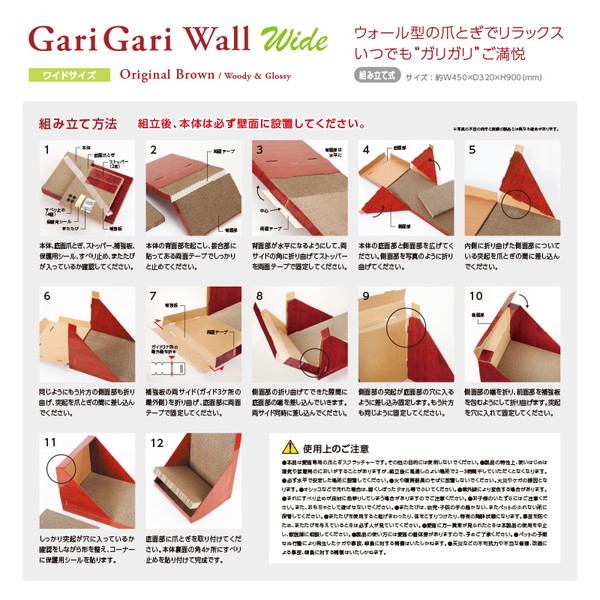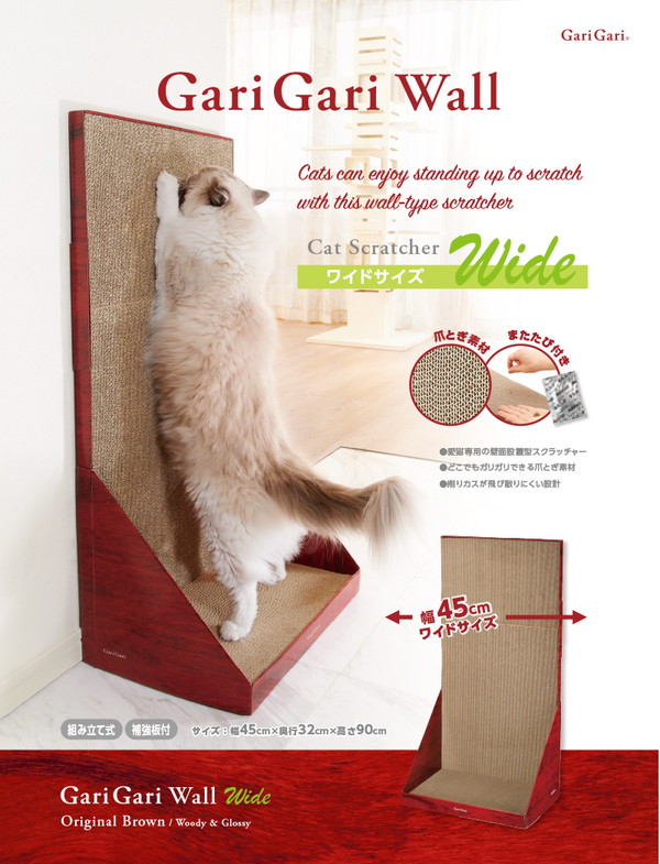 人気のガリガリウォールのワイドサイズ。愛猫たちが最高にくつろげるように開発された、愛猫専用ウオール型スタンディングタイプの爪とぎです。幅がレギュラーサイズの約1.3倍のワイドサイズ45cm、高さも90cmのゆったりサイズ。愛猫が立ったまま背伸びして使える、壁面設置型スタンディングタイプです。爪とぎ時の削りカスが飛び散りにくい構造設計になっています。愛猫がどこでも爪をとげるように、内側はすべて段ボールの爪とぎ素材を使用。さらに、愛猫が興味を示さないときに、爪とぎにふりかける「またたび」を付属しています。