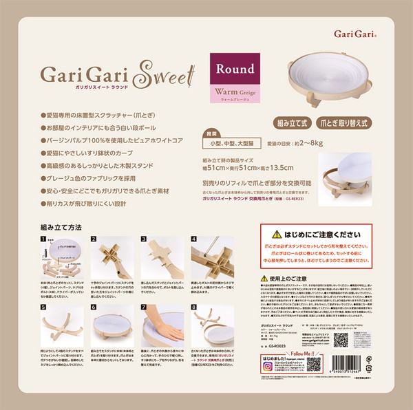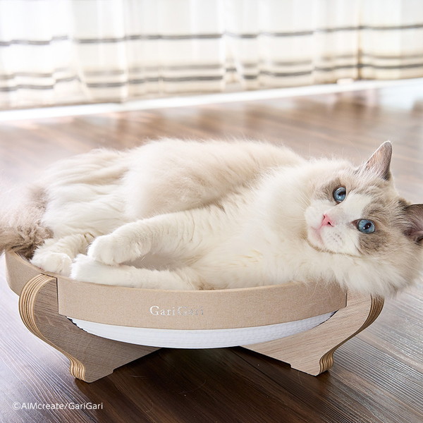 しっかりとした木製スタンド、枠にはファブリックを採用したラウンドタイプ。別売りのリフィルで爪とぎ部分を交換可能。ガリガリスイートの爪とぎ本体部分には、お部屋のインテリアにも合う白い段ボールを使用しています。この白い爪とぎ素材は、環境・森林保全に配慮したバージンパルプ100%の紙で作られた「ピュアホワイトコア」です。蛍光染料などの有害物質を含まず、食品衛生法(食品、添加物等の規格基準 第4おもちゃ準用)にも適合した安全な素材です。うっかり愛猫がなめてしまっても安心です。また、段ボール部分の接着には、植物性でんぷん糊を使用しています。