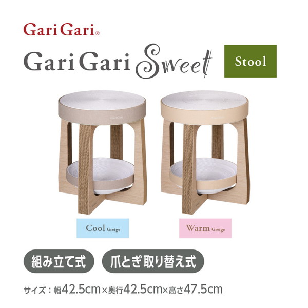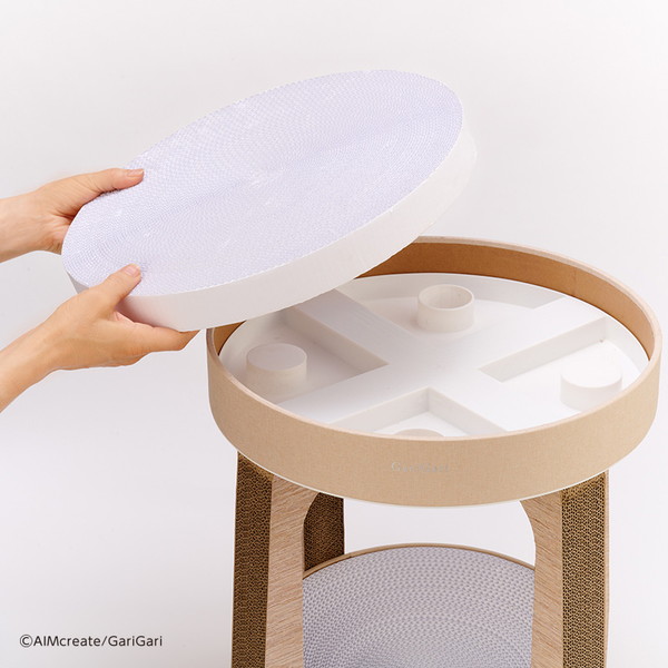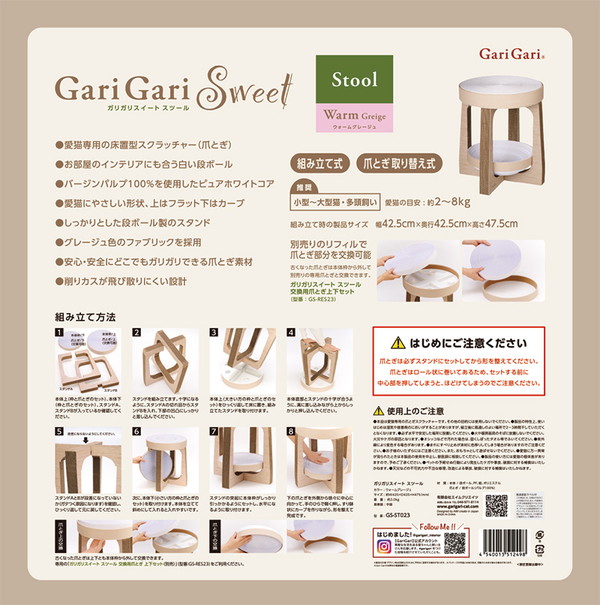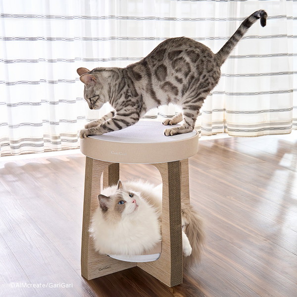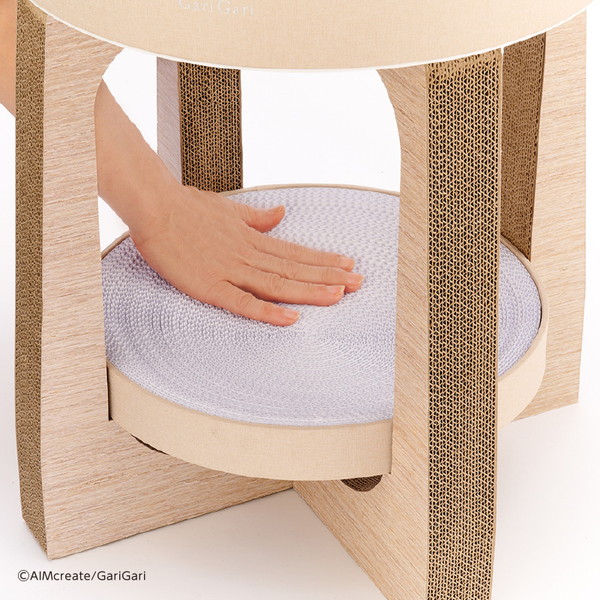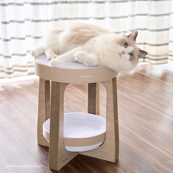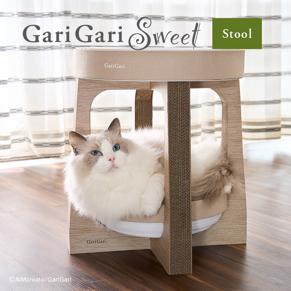 2階建てのスツール型。枠にはファブリックを採用。別売りのリフィルで爪とぎ部分を交換可能。ガリガリスイートの爪とぎ本体部分には、お部屋のインテリアにも合う白い段ボールを使用しています。この白い爪とぎ素材は、環境・森林保全に配慮したバージンパルプ100%の紙で作られた「ピュアホワイトコア」です。また、段ボール部分の接着には、とうもろこし由来のでんぷん糊を使用していますので愛猫も安心して使えます。