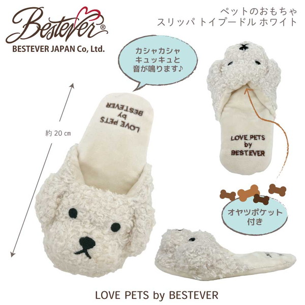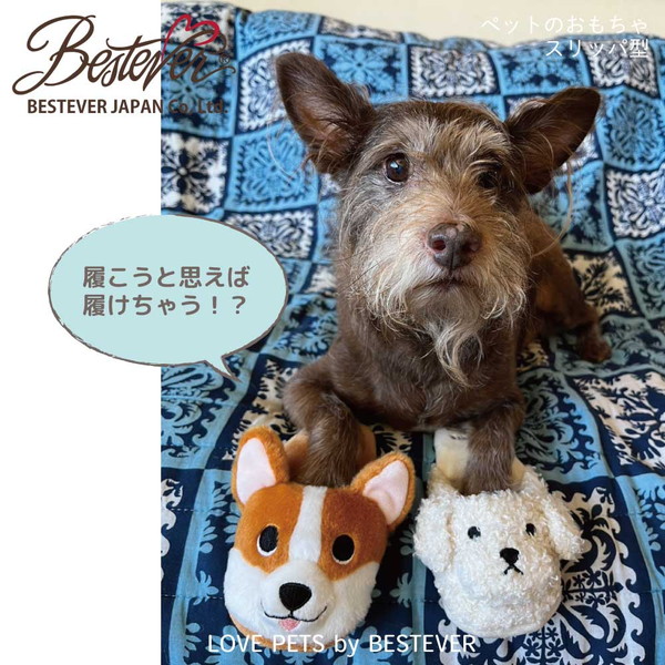 まるでホンモノみたいなスクィーキースリッパのペットトイ。赤ちゃん用みたいなミニサイズでかわいい!スリッパの足先部分にはかわいいワンちゃんの顔がついているのでワンちゃんも興味津々。スリッパの底面には綿が入っていないので小さい子でもくわえやすく、カミカミして楽しめます!握ったり噛んだりすると、シャカシャカ、キュッキュッと楽しい音がするのでワンちゃんも大喜び。スリッパ部分とお顔部分は違う素材なので、ワンちゃんも飼い主さんも楽しいおもちゃです。これで飼い主もスリッパは安全♪写真映えもバッチリなので、インスタなどのSNSなどのネタにぜひどうぞ!