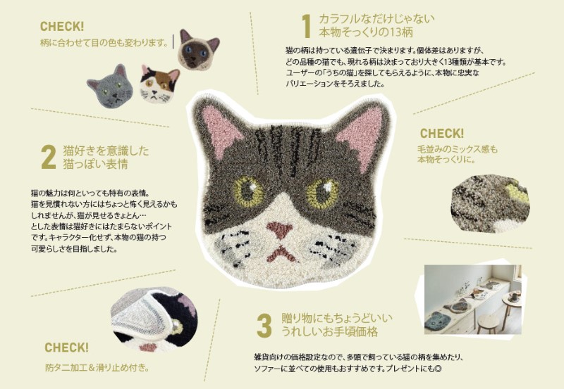 13種類の猫の顔を忠実に再現したかわいいマットです。
