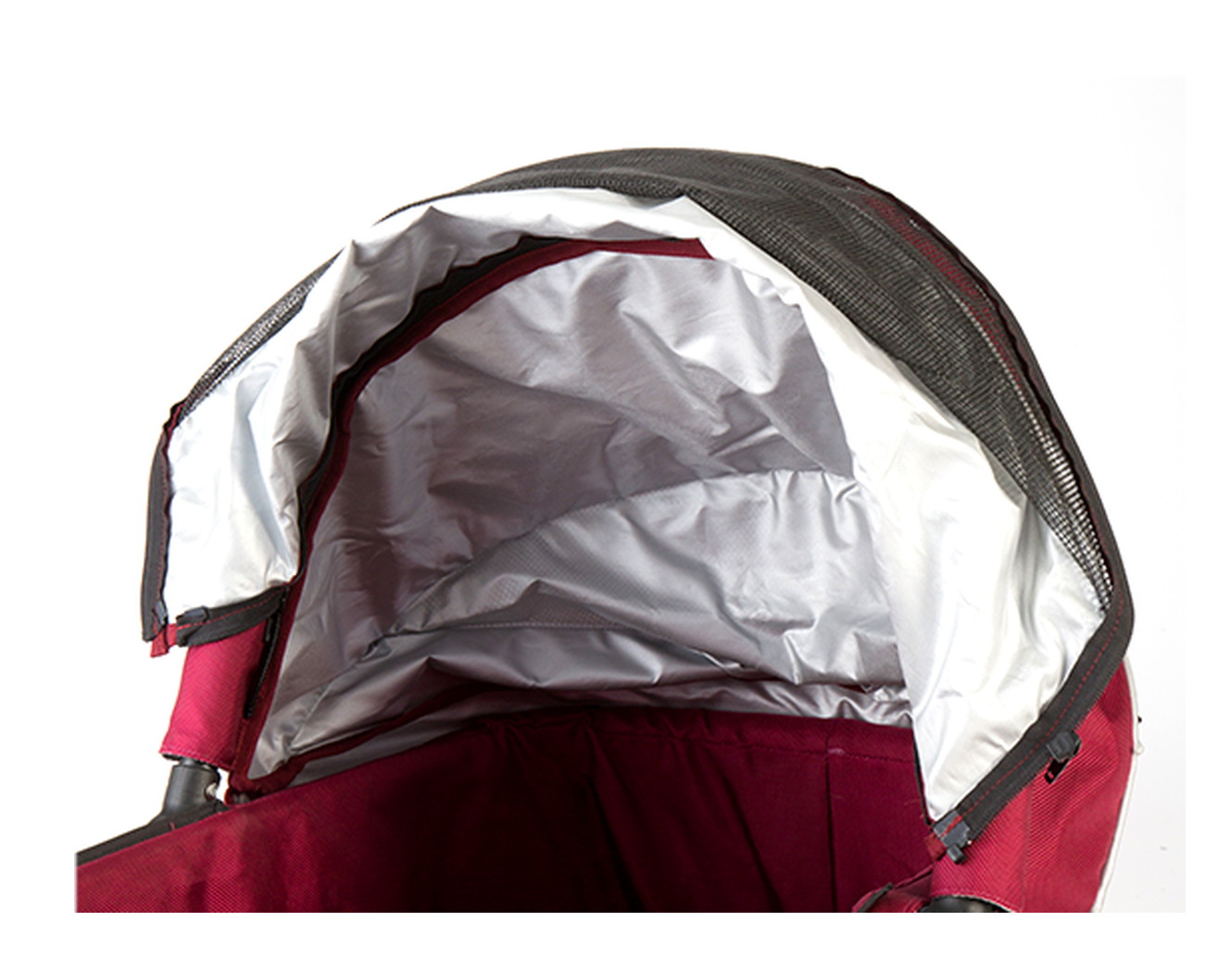 UVカット加工/折りたたみ式目隠しファスナー付日よけ 折りたたみ式の日よけは内側のUVカット加工で真夏の外出も快適。 ファスナー付で周辺環境に応じて閉じることができます。 キャリーコットは簡単に取り外せますので、ハウスや車で移動の際のクレートとしてもお使いいただけます。