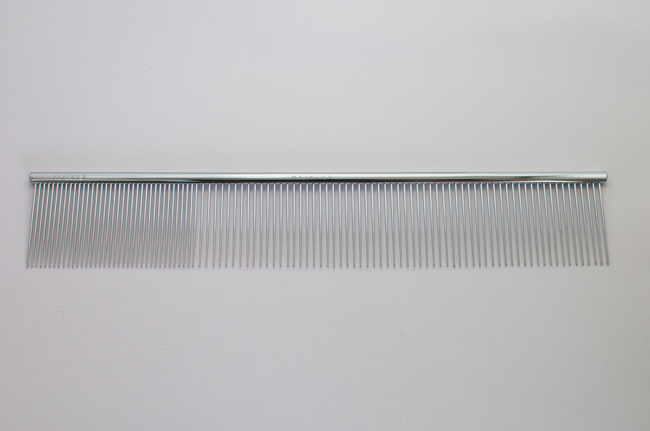 全長230mm×ピンの長さ34mm 極細ロングステンレスピンを使用した最軽量コーム。細かなピンの間隔と毛通りの良さで被毛を根元からしっかりと立ち上げます。弾力性のあるピンが皮膚や被毛に負担をかけません