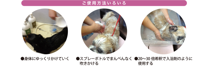 ・シャンプー後水気をきり、2倍~5倍に薄めたものを皮膚全体にかけてしっかり馴染ませてください