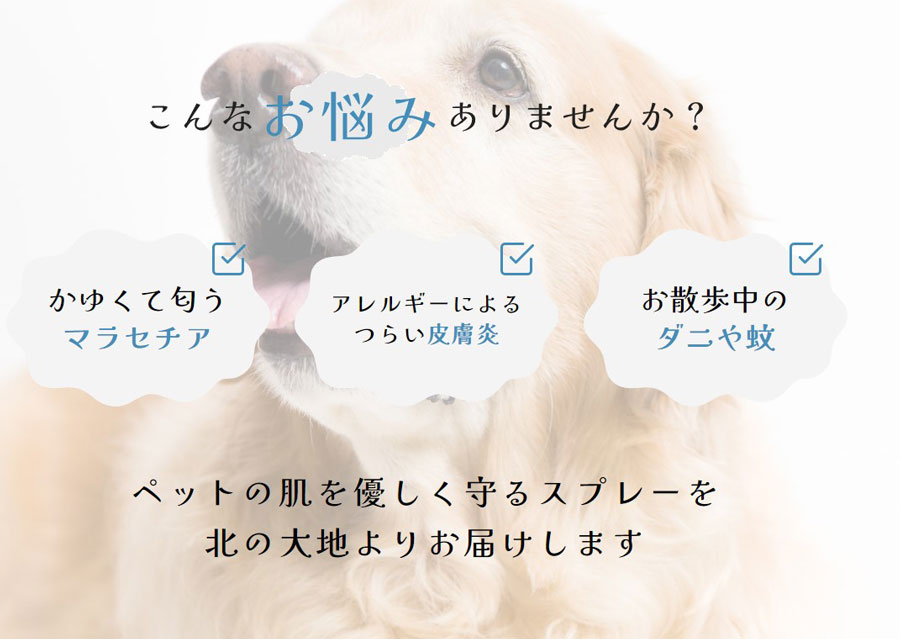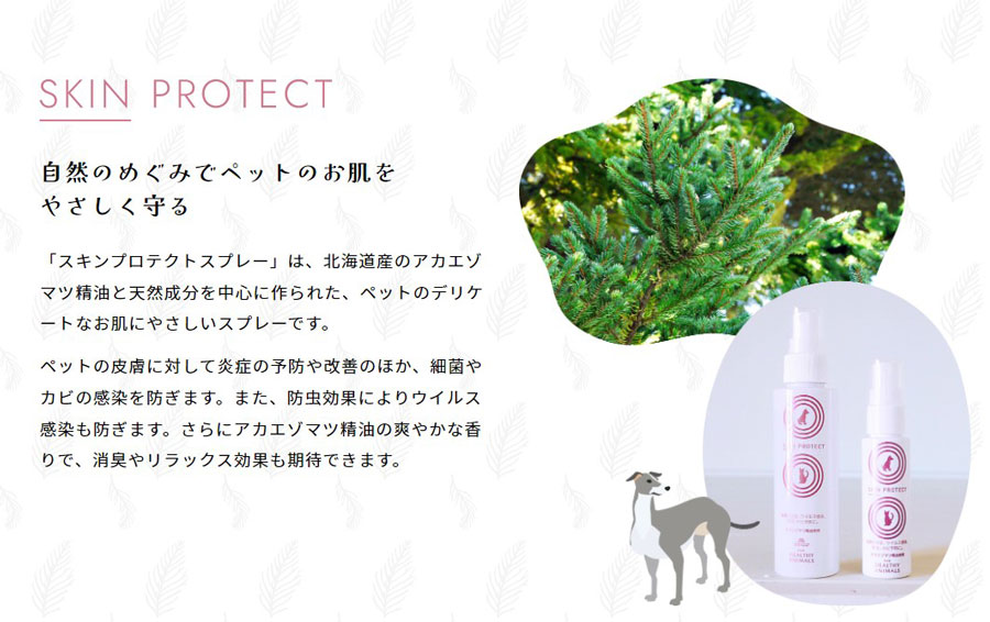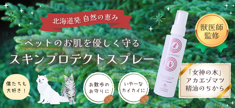天然素材のスキンケア犬・猫の皮膚の炎症、マラセチア菌、細菌の抗菌、リラックスにスキンプロテクトスプレー【北海道細菌学会にて多種類の菌種に抗菌性があると獣医師学会にて発表】ペットの皮膚に対して炎症の予防や改善のほか、細菌やカビの感染、防虫によるウイルス感染を防ぐ症例が発表されております。。さらにアカエゾマツ精油の爽やかな香りで、消臭やリラックス効果の高い、ヒーリングスプレーです。アカエゾマツは北海道東部の針葉樹林に多く、アイヌの人々に「女神の木」と呼ばれています。香りがとても良く、抽出した精油には「皮膚の炎症改善、抗菌、リラックス作用」など数多くの効果症例が獣医師学会にて発表されております。◎抗菌作用で細菌汚染や感染予防。◎快い香りによって副交感神経を優位にし、ストレスホルモンを低下させ、ストレス予防。◎抗真菌(抗マラセチア、抗カンジタ等)を活性化し、真菌(カビ)感染を予防。◎アトピー、皮膚炎予防(改善された症例が獣医師学会で発表)◎抗MRSAによって耐性菌の感染を予防。◎蚊・ハチの防虫